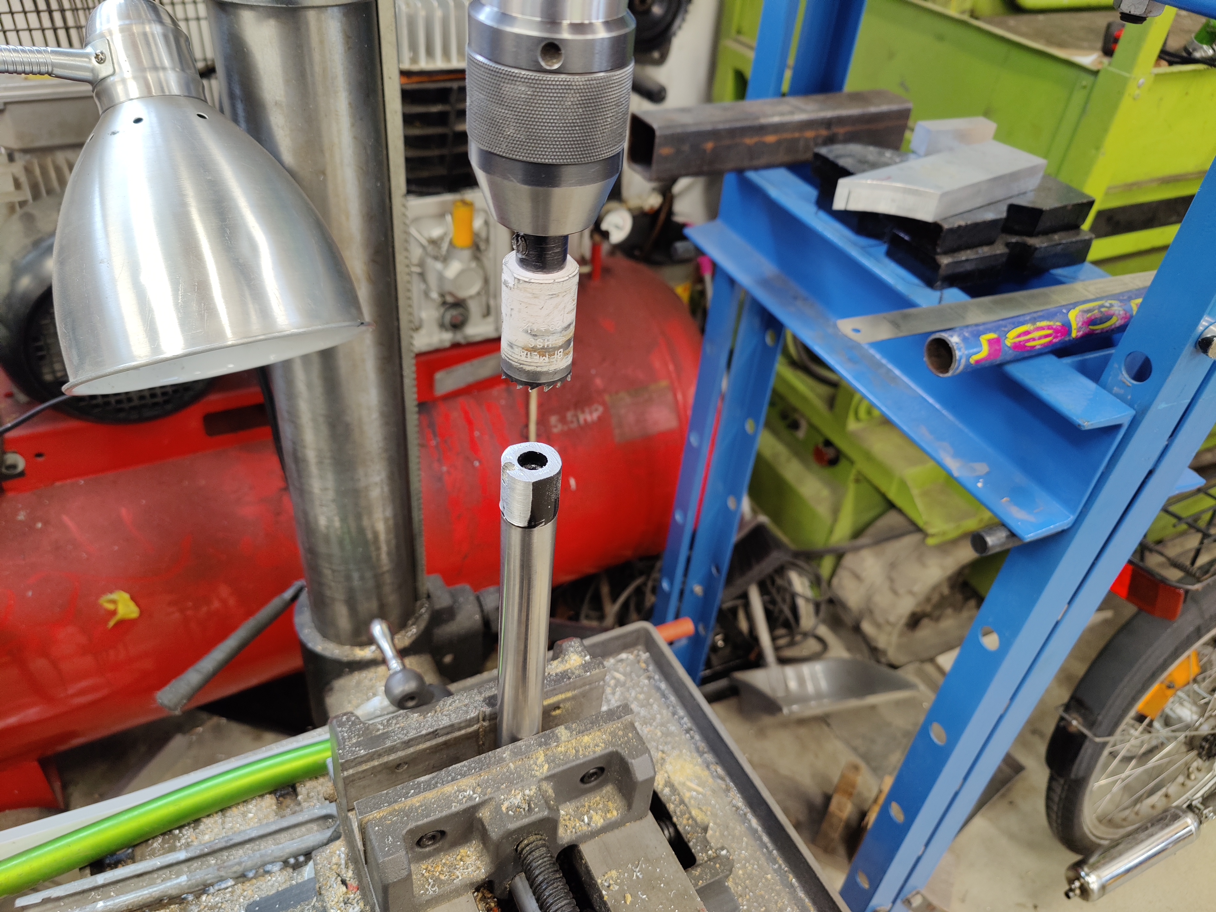 Hommasin toisen stemmin ja reikäsahasin siitä ohjaustangon kiinnittimen irti. Reikäsaha ei ollut aivan oikean kokoinen. Viimeistely viilalla.