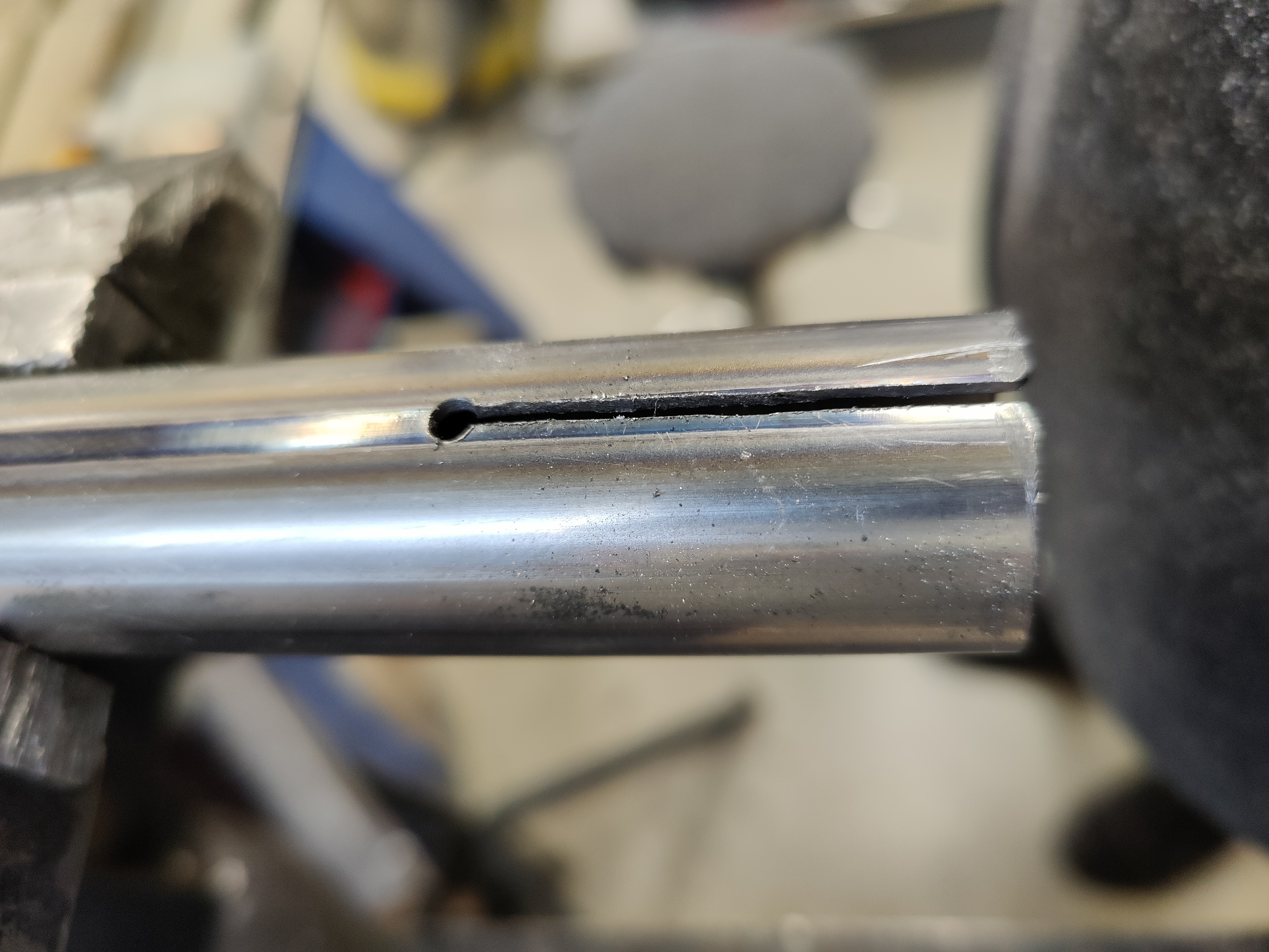 Tuumaisen stemmiputken päälle lähimmäs sopiva oli 30x2 putki, johon leikkasin puristushalkion. Liikaa välystä suoraan kiristykseen, jonka ratkaisin pätkällä ohutseinäistä alumiinista verhotankoa (=putkea). Halkaisija oli hieman pieni, mutta halkaisin putkenpätkän ja muotoilin stemmin ympärille. Tuli tosi napakka sovite.