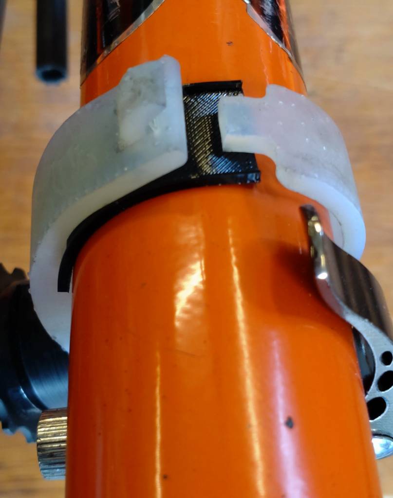 Wackyn suunnittelema versio ketjunkiristimen kiinnikkeestä. Oranssia ASA:aa.