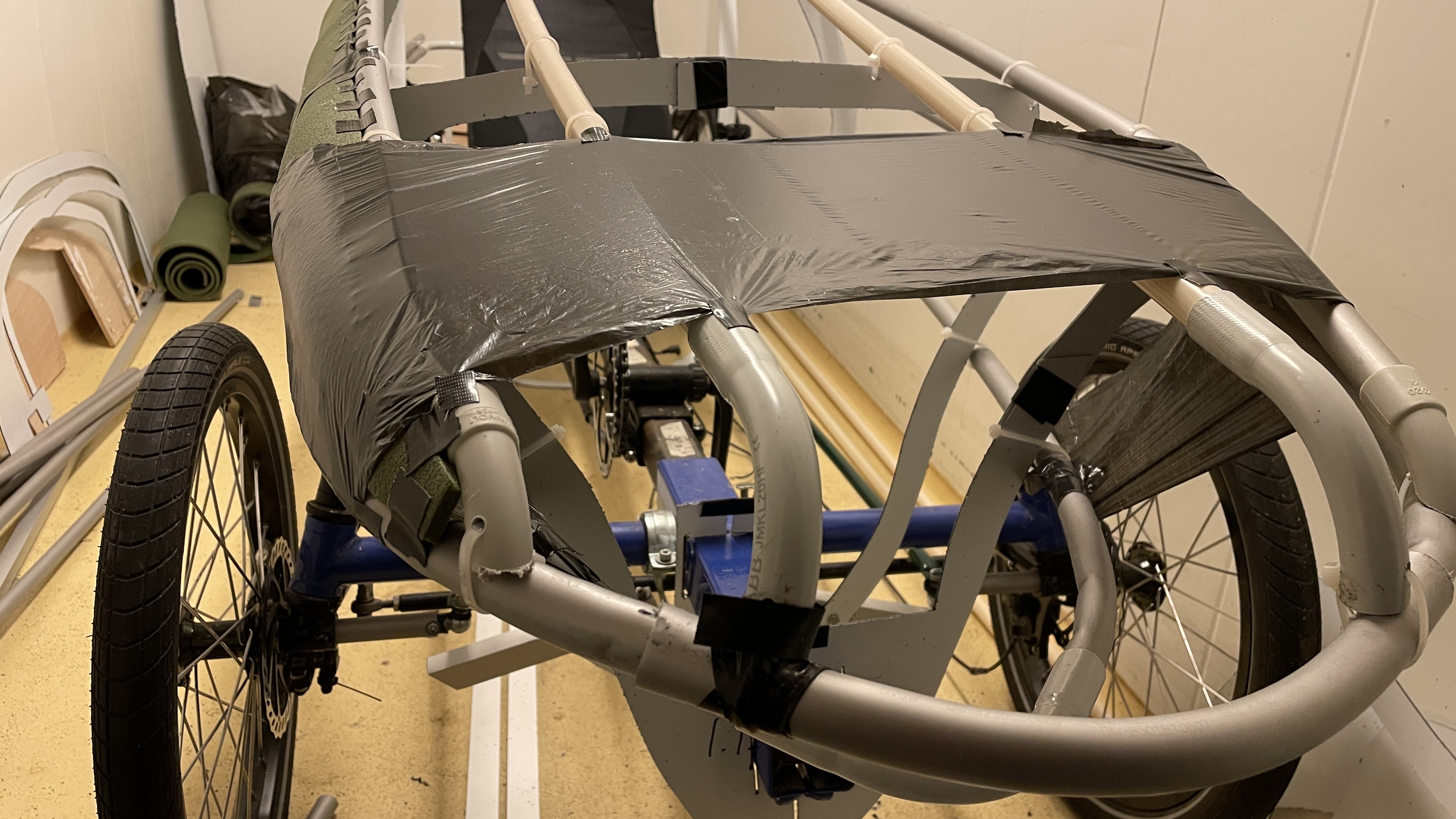 Mielessäni olen pähkäillyt, miten vältän tässä kangaskatteessa kankaan kiristymisen kahden putken väliin sateenvarjomaisesti sisäänpäin.