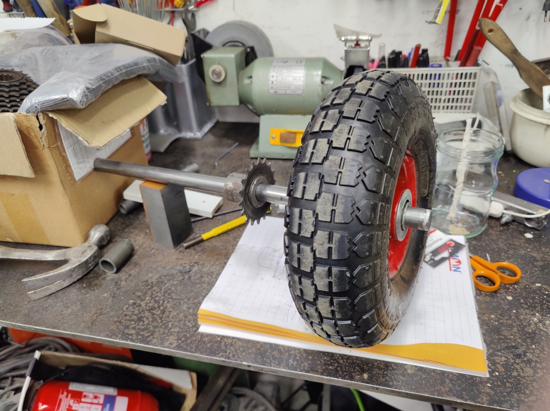 Nyt tarvitaan ehdotuksia. Miten kiinnitetään tuollainen kottikärryn vanne akseliin kiinteästi, mutta irroitus mahdollisuudella?