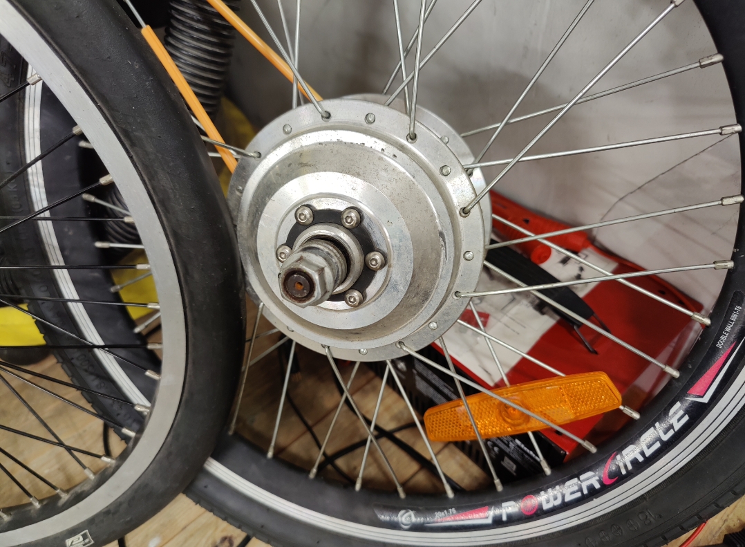 Niin tässähän on säilymässä polkuetuveto ja tulossa sähkötakaveto. Napamoottori irroitetaan pinnoista ja jarrulevyn paikalle tulee ketjuratas.