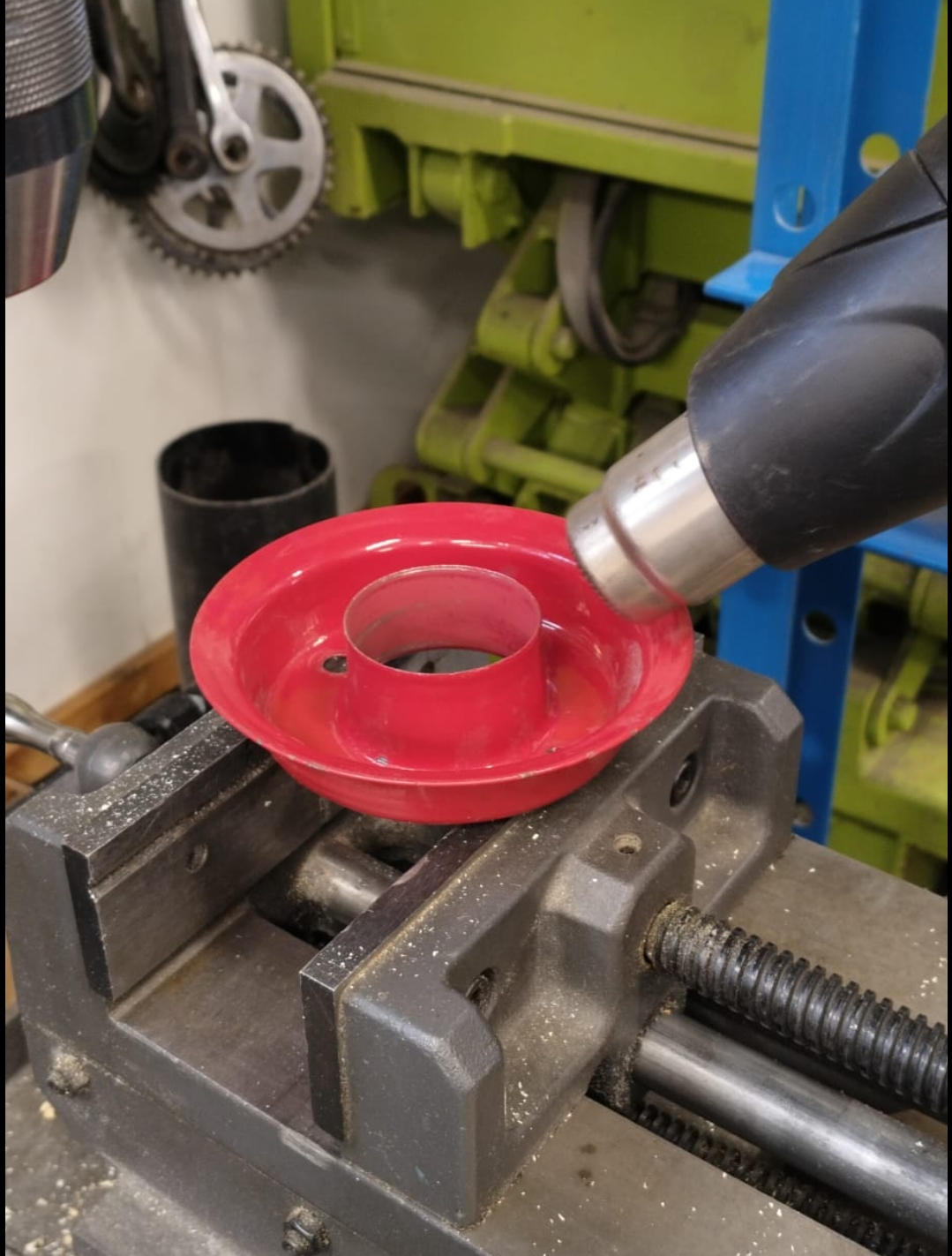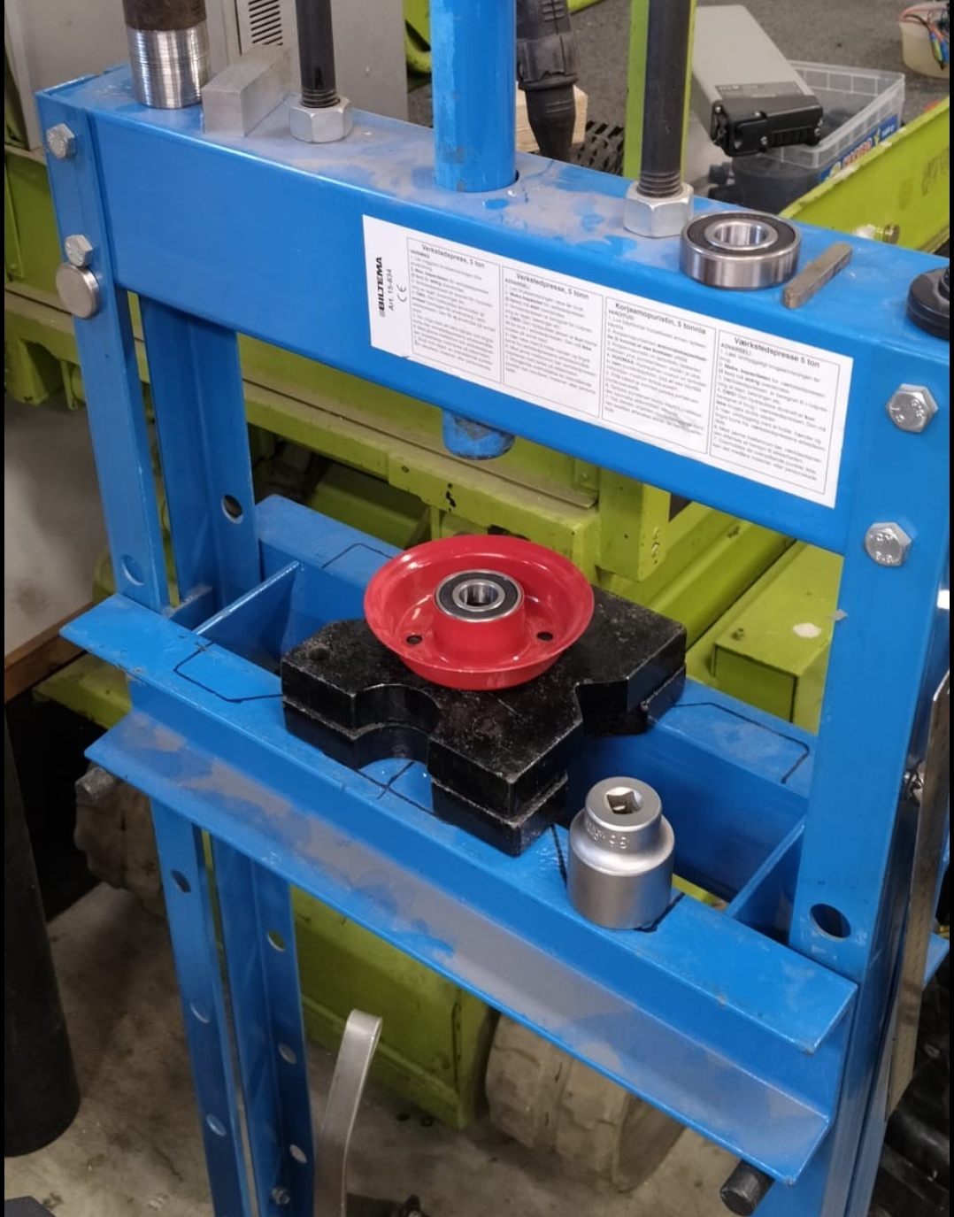 Ensinnäkin laakerit ovat aivan tosi väljät. En tiedä kuka valmistaa tuollaisia ja miksi? Laakereitahan tähän ei olisi tarvittu ollenkaan, mutta sorviholkkeja ei taida 3€/kpl saada. 6204 laakerit sai, niin pahin välys vanteen ja akselin välistä poistui. Laakerit oli parikymppiä liian suuret pesäänsä, mutta lämmittämällä ja prässillä avustaen ne juuri ja juuri sai paikoilleen mikään särkymättä. Pelotti vanteen peltisen laakeripesän tuhoutuminen.