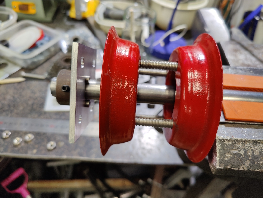Hyllystä löytyi pari kappaletta top-ruuvillisia sorviholkkeja. Sen kylkeen kierteet ja ruuvattiin 3xM5 pultilla alumiinilevy, jossa vanteiden pulttijako. Pidemmät pultit joihin putkiholkit päälle ja koko hoidon kasaus. Ehkä lopullinen kasaus on tehtävä liiman/lukitteen kanssa. Aivan hirveää rasitusta tähän ei tule, koska liukkaat kulutuspinnat renkaissa.