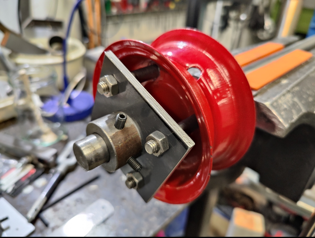 Nyt tarvitaan ehdotuksia. Miten kiinnitetään tuollainen kottikärryn vanne akseliin kiinteästi, mutta irroitus mahdollisuudella?