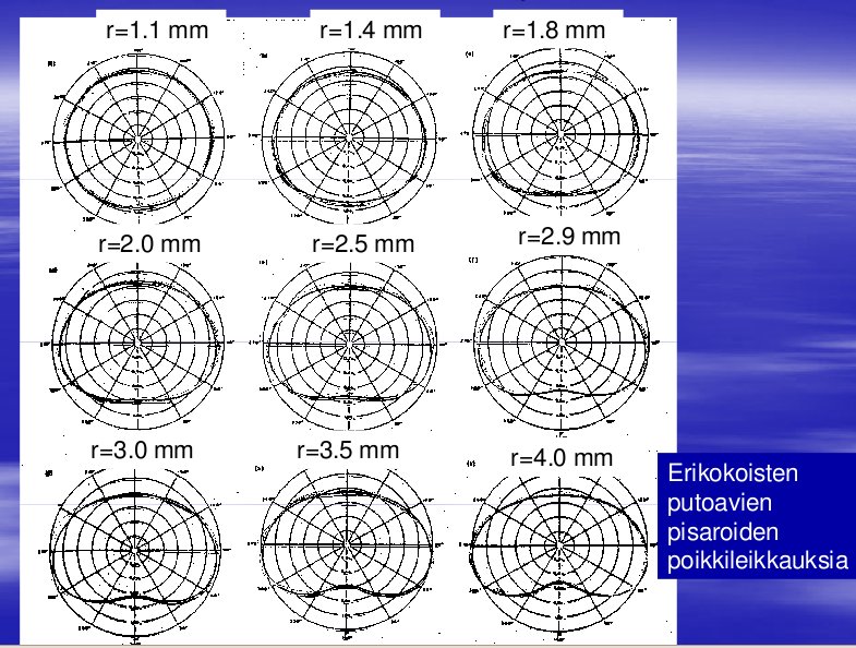 Vesipisaran muotohan muuttuu juuri sen verran, mitä ilmanvastuksen aiheuttama muovaava voima pystyy pystyy tappelemaan veden pintajännitystä vastaan. Pintajännitys ajaa pisaraa palloksi ja ilmavirta yrittää tehdä pisarasta pitkulaisen pitkällä hännällä. Pitäisi kait kysyä, miltä näyttää pisara juuri ennen hajoamistaan pienemmiksi osiksi nopeuden aiheuttaman ilmavirran takia? Muutoinhan pisaran muoto riippuu sen tilavuudesta; pienemmät pisarat putoavat hitaammin ja muotoutuvat vähemmän.
