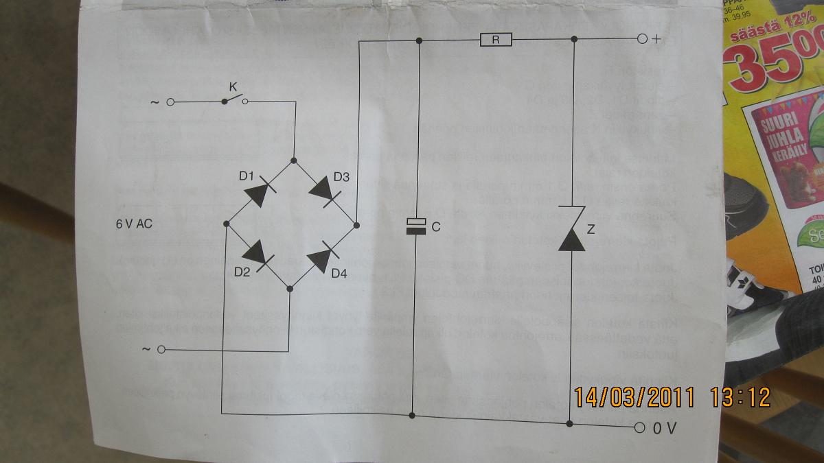 Regulaattoria ei ole osaluettelossa vaan: resistori 5 w (R), elektrolyyttikapasitori (C), 4 kpl diodeja(D1-D4), ja zenerdiodi 6,8V (Z)+ johdot ym.