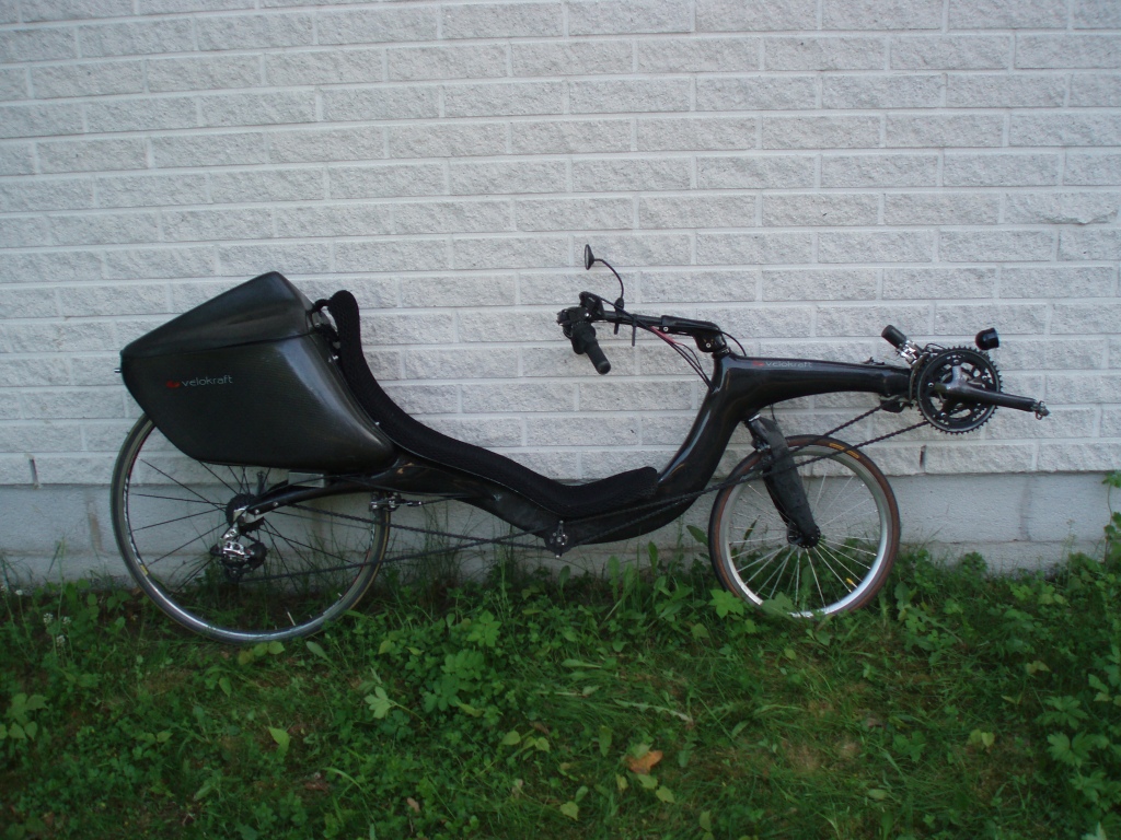 Paino on kuvassa 12.6kg. Tämä on pitkänmatkanpyöräni/työmatkapyörä kesällä. Kuituosat on velokaftilta; runko, haarukka, ohjaustanko, kannellinen avattava takakoppa, osat on itse shoppailtu ja yhteen kasattu, velokraft myy vain runkosarjoja. Pyörässä on dynamonapa, 3W ledivalo edessä, dynamo tuottaa virran myös yksinkertaiseen GPS laturiin, joka on todella hyödyllinen peli kun matkat kestävät kauemmin kuin lataus gepsissä. VK2 on semi-low-racer, sormenpäät ulottuvat juuri ja juuri maahan. Tällä on riittävän rento ajaa kaupungissakin, mutta omimmillaan pyörä on maantiellä. VK2 on kevyt, nopeahko ja takakoppaan mahtuu riittävästi tavaraa, suosittelen pyörää nopeasti ja pitkälle haluavalle mutta en aloittelevalle nojailijalle koska ketju menee aika läheltä etupyörää ja ajoasento on hyvin taakse nojaava, eli ei näe taakse ilman peiliä tai täytyy ainakin niskaa kääntää paljon, näihin asioihin tottuu. Jos jotain negatiivistä täytyy löytää niin etupuomi voisi olla jäykempi, ylämäessä tuntuu pientä sivuttaisliikettä. Pyörä on eri inkarnaatioissaan nähnyt seitsemässä vuodessa noin 30000 km.