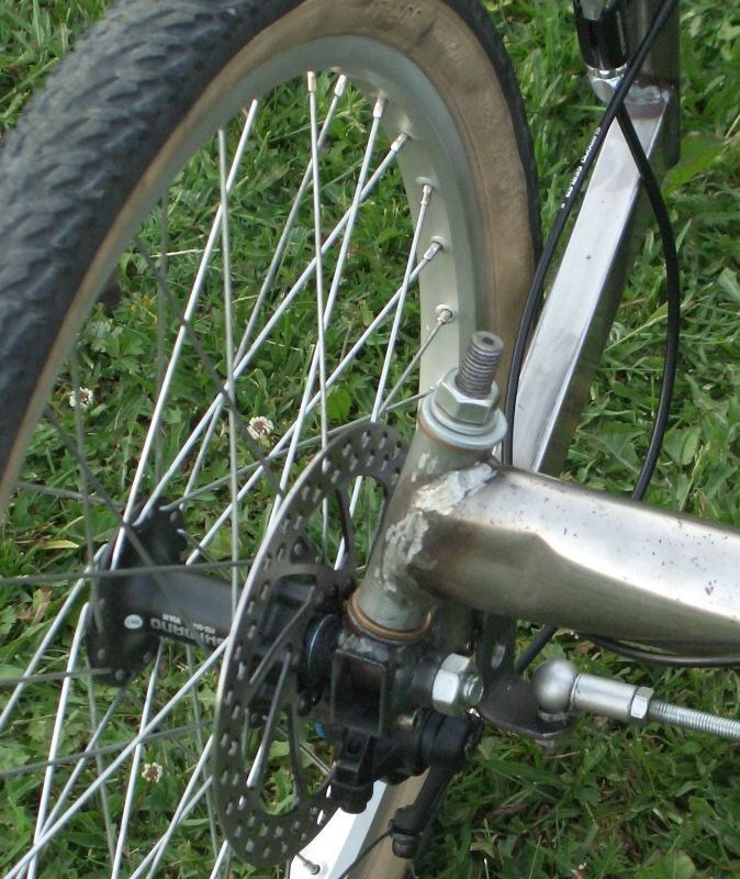 Asiasta en mitään ymmärrä, mutta kuvasin vähän Alku-triken rakennetta. Siinä on varmaan tehty asia niin yksinkertaisesti kuin sen vain voi tehdä. Ohjausakseli on laitettu suoraan runkoon oikeaan kulmaan. Levyjarrukiinnike on hitsattu suoraan ohjausakseliin erillisenä rakenteena, samoin raidetangon pään kiinnitys.