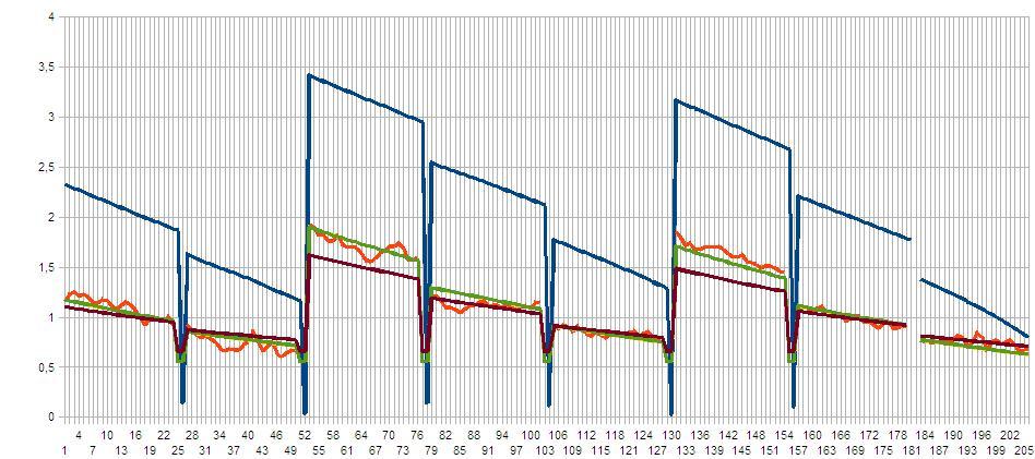 Kiihtyvyys kuvissa on tietysti negatiivinen, vaikka se on piirretty positiiviseksi. (punaset arvot). Ennusteet on laadittu arvioimalla kiihtyvyys Y nopeuden neliön X funktiona Y = A + B * X pienimmän neliösumman avulla. Kertoimet A ja B määräytyvät sen mukaan, mitä arvopareja X(i), Y(i) käytetään optimoinnissa. Vihreä käyrä kuvaa kaikkia 8 rullauksen arvoja, keltainen 4 keskimmäistä (keltainen käyrä tässä tapauksessa vihreän takana), ja ruskea 2 keskimmäistä rullausta eli rullaukset 4 ja 5. Ruskea käyrä sopii kuvan mukaan kauniisti rullauksiin 4 ja 5, mutta eipä niinkään hyvin muihin. Pitää olla suuria ja pieniä nopeuksia mukana regressiokäyrää laskettaessa. Ei riittäne pari havaintoa.
