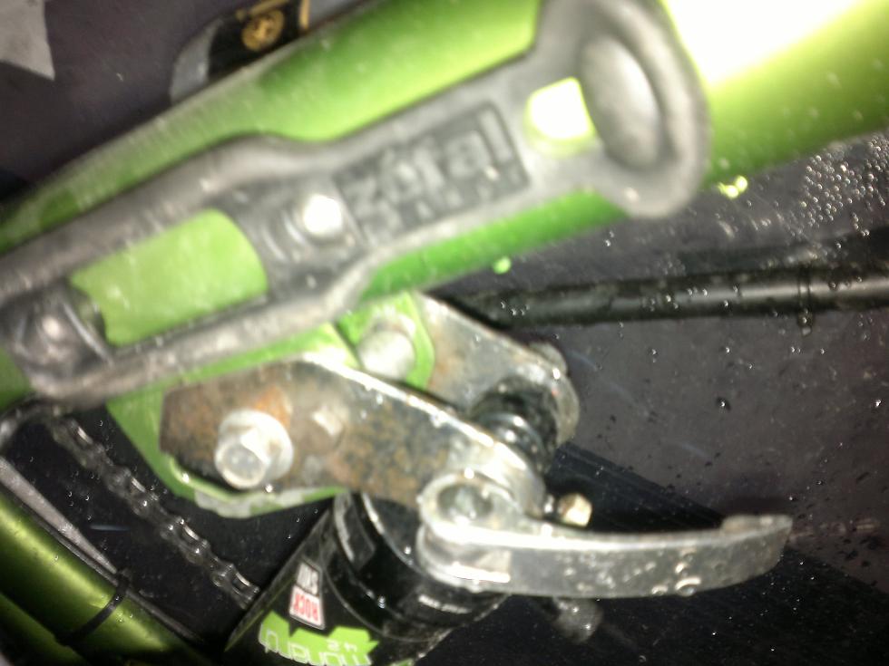 Tässä lupaamani kuva jousen kiinnikkeestä, se on kiinni kahdella pultilla vanhassa iskarin kiinnikkeessä ja vanhan kiinnikkeen sisään/pultteíhin laitoin holkit, ettei vanha kiinnike painuisi länään. Tuo iskari on vähän pitempi ja nyt kun iskariin laittoi "sopivasti" (muistaakseni 12,5bar, ihan mututuntumalla mennään) ilmaa niin se ei juurikaan painu kun istahtaa jakkaralle mistä johtuu se, että ajoasento ja muuttui pystymmäksi ja istumakorkeus tuntuisi olevan vähän korkeampi kun vertaa vanhaan. Ylösalaisin asentamalla (kuten vanha) tuo mahtuisi paikallee vanhaan kiinnikkeeseen mutta mun mielestä kaikki kurapaska olisi ajanoloon menossa iskarin sisään, tiedä sitten olenko vaan vainoharhainen? "kesäkiinnikkeet" vielä teen sellaiset missä ajoasento on aavistukseen makaavampi.