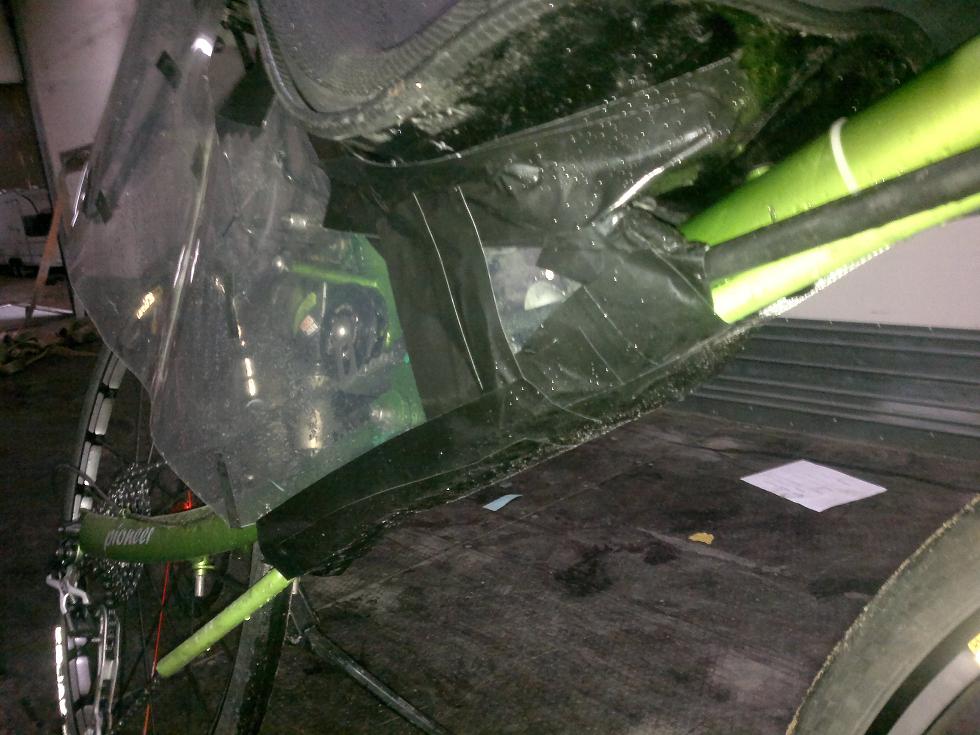 Pvc-kalvot ei lepata ajaessa, ne on pääosin nippusiteellä kiinni tarakassa ja yläreuna on vahvasti teipattu penkkiin ja poksiin, ajansaatossa tuuli on painanut ne vähän aalloille eli kiinnitys ei ole ollut täysin kireä ja esim. pullotelineistä johtuen täysin suoraksi ei saakkaan, mutta tuo on jäykkähköä materiaalia ja ei lepata, jäykkäperäiseen kiinnittäminen olisi helpompaa ja kavoista saisi peittävämmät. Hyötyä on, kokeiluversio mansikkamaamuoveilla parannus testiajossa oli keskinopeuden osalta 2,4% (huonommissa olosuhteissa) http://www.nojapyorafoorumi.fi/viewtopi ... =90#p23360 nyt kiinniolevat kalvot on peittävämmät ja tässä viimeisessä virityksessä teippasin penkin alta ylimääräiset reiät katteesta umpeen jotta ilman saisi kivemmin kulkemaan. Nyt kun tuo perä on iskarimuutoksessa vähän noussut niin uudet peittävämmät kalvot pitäisi tehdä, onneksi sitä tuli ostettu 4 neliötä kerralla. Mutta väitän, että näistä hyöty on isompi kuin tuo 2,4% ja mitä kovempaa mennään sen enemmän niistä on hyötyä.