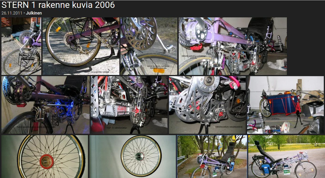 Sanovat että parempi myöhään , kuin ei milloinkaan. Niin ajattelin että laitanpa tämä jo menneen pyöräni kuvahistoriaa. Nykyisyydestä en tiedä , toivottavasti on viellä ajossa ja hyödyttämässä jonkin intohimoja. Itse olin kohtalaisen tyytyväinen tekeleeseen ja kokeilin kaikkia hullujakin ideoita jotka päähäni pälkähti. Niinkuin että laitoin Fordin tartimoottorin ja rakensin sille hirvittävän mekanismin välityksessi ,no pääsi sen avulla aikanaan Vesmannin mäkee 47km/h ylös ja puhtaasti . Mutta nuo ryökäleen ensiövälityksen rattaat eivä kestäneet , tätä pientä moottoria . Vaan vääntyivät , olisi pitänyt rakentaa jonkinlainen nykäyksen hillitsin ketjulle . Sen järjestelmän sit hylkäsin aika pien, saipa siittä ainakin ensinmäiset rakentamisen himot tyydytettyä . Kuviakin laitoin joitakin ja laitan sen katselu osoitteen tähän. 8)https://picasaweb.google.com/1182308860 ... 10/STERN1# Se punainen hämis takavanne oli sellainen hullu idea tehdä pinnatusta vanteesta levykiekko. Kyllä se kesti ja ajettua tuli mokomalla tekeleellä yli 30000km, navankin siihen rustasin itse . :twisted: Alkujaan jopa pyörän takavaihde oli omaa tuotantoa. Tallessa se on ja seinälle menossa , kunhan siihen jonkinlaisen vitriinin ehtii rustaamaan . Vaihde muuten toimi mielestäni odotuksia paremmin. :shock: