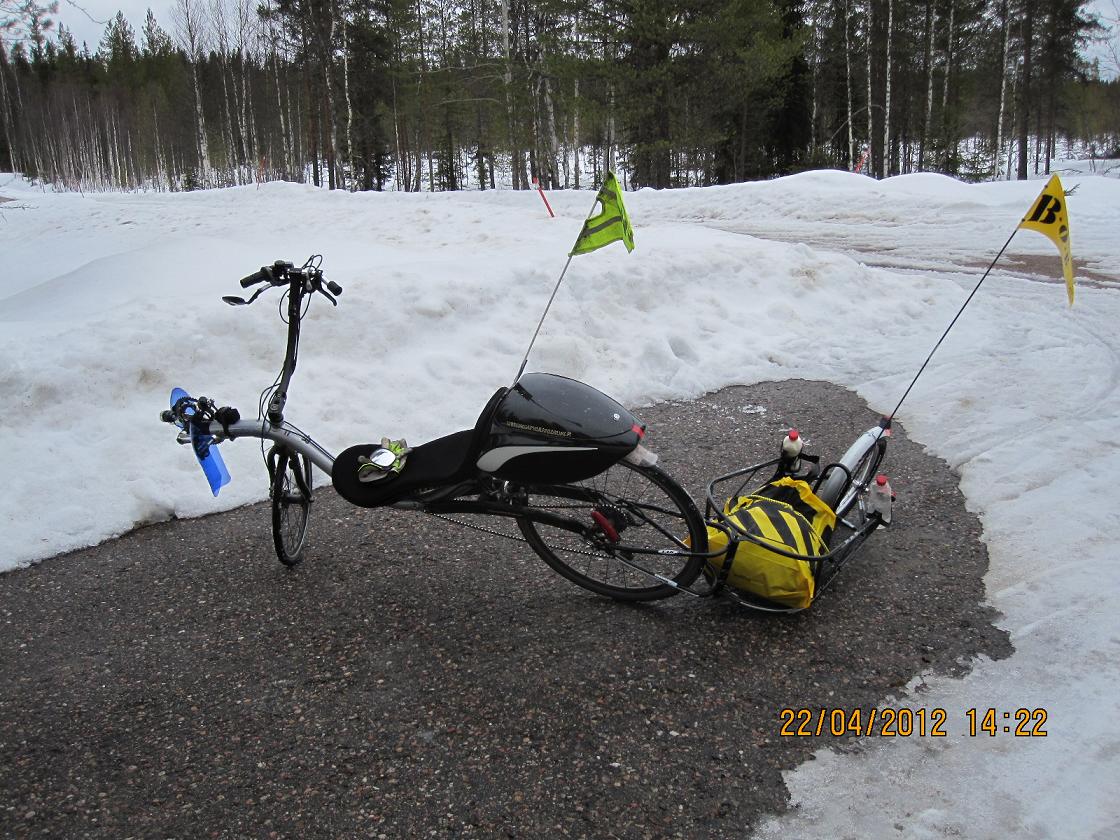 Vihdoin ja viimein on Bob Yakki koevedetty. Kävin Suomussalmelta Puolangan puolella Hepokönkäällä kääntymässä ja matkaa tuli 115,5km. Koko matka oli asfalttia mikä tosin oli pitkät pätkät aivan surkeassa kunnossa. Mäkiä oli sen verran, että ehkä rankin reitti mitä tähän saakka olen ajanut. Tavaraa oli mukana jotain 8kg mutta vähän se keveni takaisin tullessa kun eväät ja nesteet pääsi "tuulensuojaan" eli kärryn kokonaispaino saattoi olla 15 kilon paikkeilla.