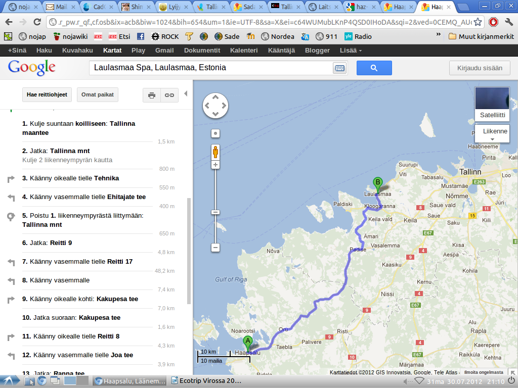 Kun huomasin, ettei minulla ole mahdollista saada pääjoukkoa kiinni, heräsi uusi huoli. Majapaikkaa oli muutettu, enkä tiennyt uutta paikkaa -edes nimeä. Päätin ajella kohti vanhan tiedon majapaikkaa ja kysyä puhelimella lähempänä minne sieltä suunnistan. Keilan kaupunki alkoi lähestyä ja suunnittelin soittavani neuvoa, jolloin Ilpo soittikin minulle. Olivat perillä ja alkoivat huolestua minusta. Selitin, että olen 12 km päässä Keilasta. Ilpo antoi puhelimen Ristolle ja hän antoi minulle ajo-ohjeet perille. Hän kuitenkin kuvitteli minun tulevan Paldiskin suunnasta, mutta olinkin 10 km etelämpänä. Ihmettelin hiukan puhelun jälkeen ohjeita, mutta ymmärsin nopeasti karttaa vilkaistuani mistä oli kysymys. Uusi majapaikka oli Laulasmaan Spa, joka tosiaan oli Paldiskin tien varrella. Suunnittelin reitin ja ajoin Laulasmaalle. Siellä oli kuitenkin jokin festivaalitapahtuma, enkä uskaltanut ajaa pidemmälle alamäkeen, etten taas eksyisi ja joutuisi palaamaan ylämäkeen takaisin. Soitin vielä pari kertaa ohjeita, kunnes pääsin viimeisen kolme kilometriä perille. Voimat alkoivat olla jo vähissä. Jokin virolaisissa opasteissa saa minut hämmennyksiin. Ilmeisesti vieraan kielen sanojen tuottamat suomalaiset assosiaatiot sekoittavat. Huomaan usein muistavani viron kieliset nimet väärin.