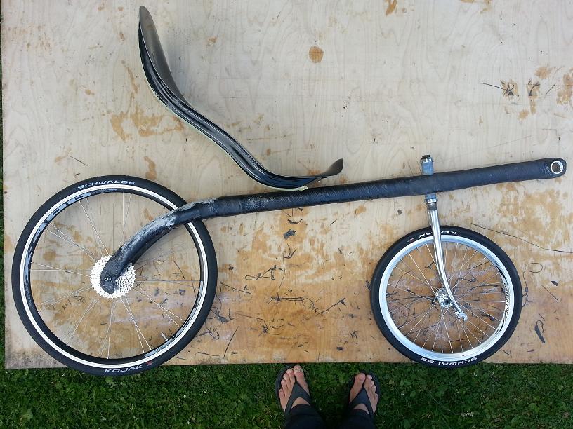 Kesä on opeteltu uretaanin hiontaa ja kuidun käärimistä. Nyt on projekti tällä mallilla. Poljinkeskiö on kuvassa liimattu paikoilleen, emäputki vielä tuossa irrallaan. Lasikuituisen penkin tilasin Jarekilta Puolasta (posteineen 51e). Etuhaarukka on tarkoitus tehdä itse haapapuuytimen ympärille käärimällä. Ketjulinjan suunnittelin vetopuolelta suoraksi, paluuketjulle ohjairissa. Istuinkorkeus n. 60cm, poljinkeskiö 65cm. Vielä voi rakenteeseen muutoksia tehdä, kohtuu vähällä vaivalla, mutta onkohan tarpeen?