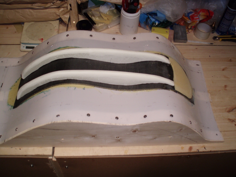 nyt oli juhlallinen hetki kun kaiken suunnitelun jälkeen sain ensimmäisen kuituosan valmiiksi :D Aloitin suositusta ja helpohkosta itserakentelun kohteesta, satulasta. Tein muotin puusta+muovilevystä, vedin selkää vasten tulevan kuoren vakuumisäkillä kiini, sitten taakse vahvikkeet ja takakuori päälle vakuumilla. selkää vasten aramidia, kolme muuta kerrosta hiilikuitua. Painoksi tuli 355g, mikä on noin 100g kevyempi kuin vastaava kaupallinen hiilikuitusatula. jos oikein yrittäisi niin voisi ehkä päästä alle 300g..... kaupallistasatulaa en voi käyttää Conessa koska istuin pitää olla matala pohjasta, muuten ei polvet mahdu.