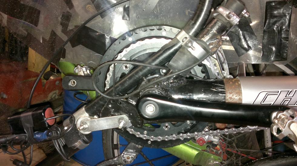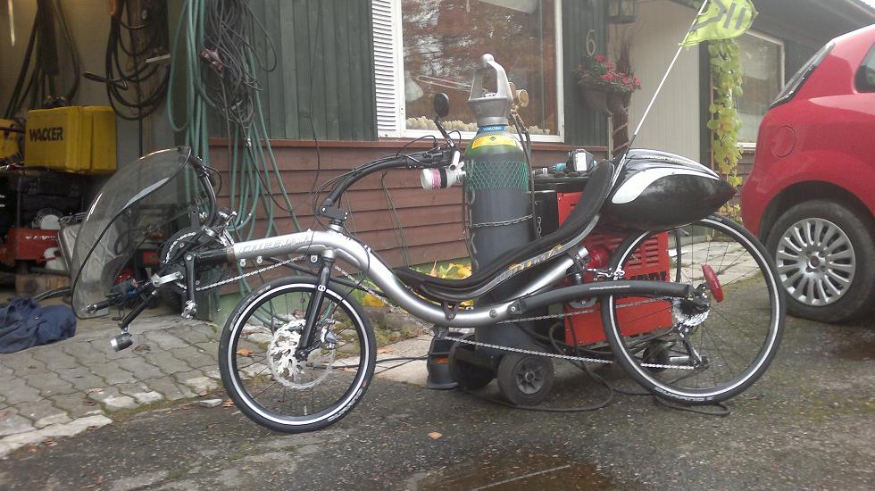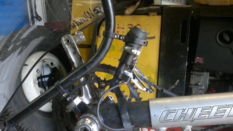 Skitso viikko ja väsy painoi eli kilometrikisan loppukiri jäi vaisuksi mutta tänään olisi ollut lenkkituulella... melkein 2 km pääsin kun muutaman hidastetöyssyn jälkeen rupesi tuulilasi painumaan etuviistoon, no vehkeet seis ja ihmettelemään. Etuvaihtajan putki napsahti poikki. Ei näemmä alumiininen kestä tuulilasin painoa, ei ainakaan jos eteen lisää lampun ja sen akun. Klemmarilla viritin härpäkkeen kiinni tuohon etukorvakkoon (mikä lienee) ja nilkutin tallille.