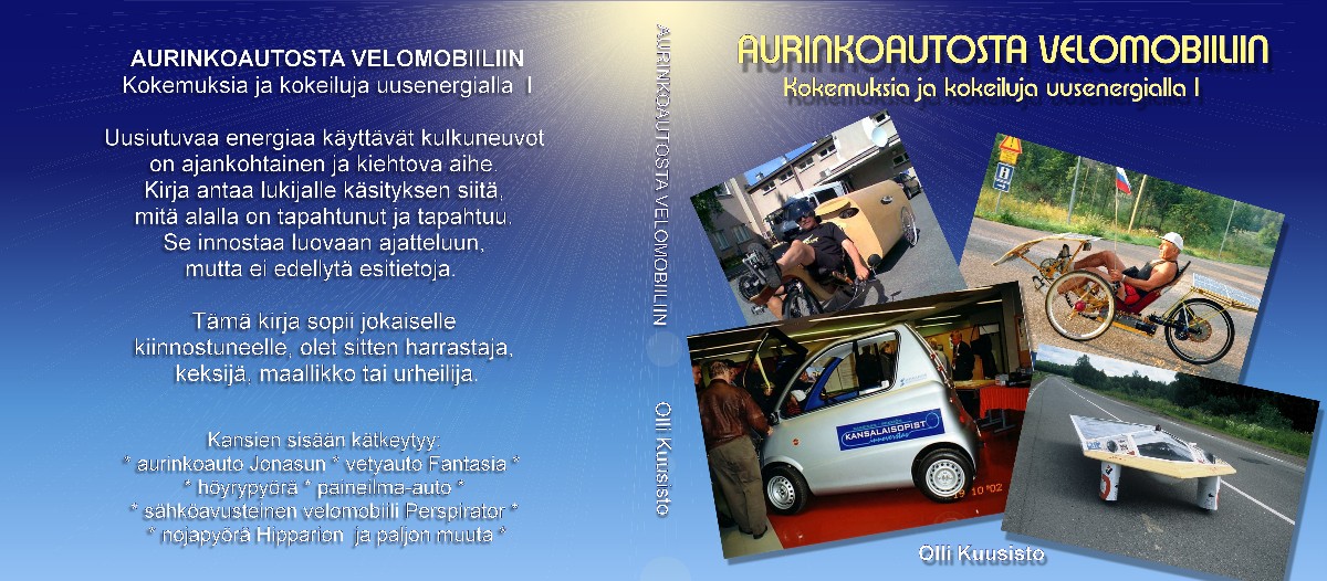 Sain tänään Turusta Kuusiston Ollilta hyvän viestin, jossa hän kertoi, että hän oli saanut melkein valmiiksi toimittamansa kirjan: "Aurinkoautosta Velomobiiliin" Uupumaan jäi osio uusiutuvaa energiaa käyttävistä veneistä.