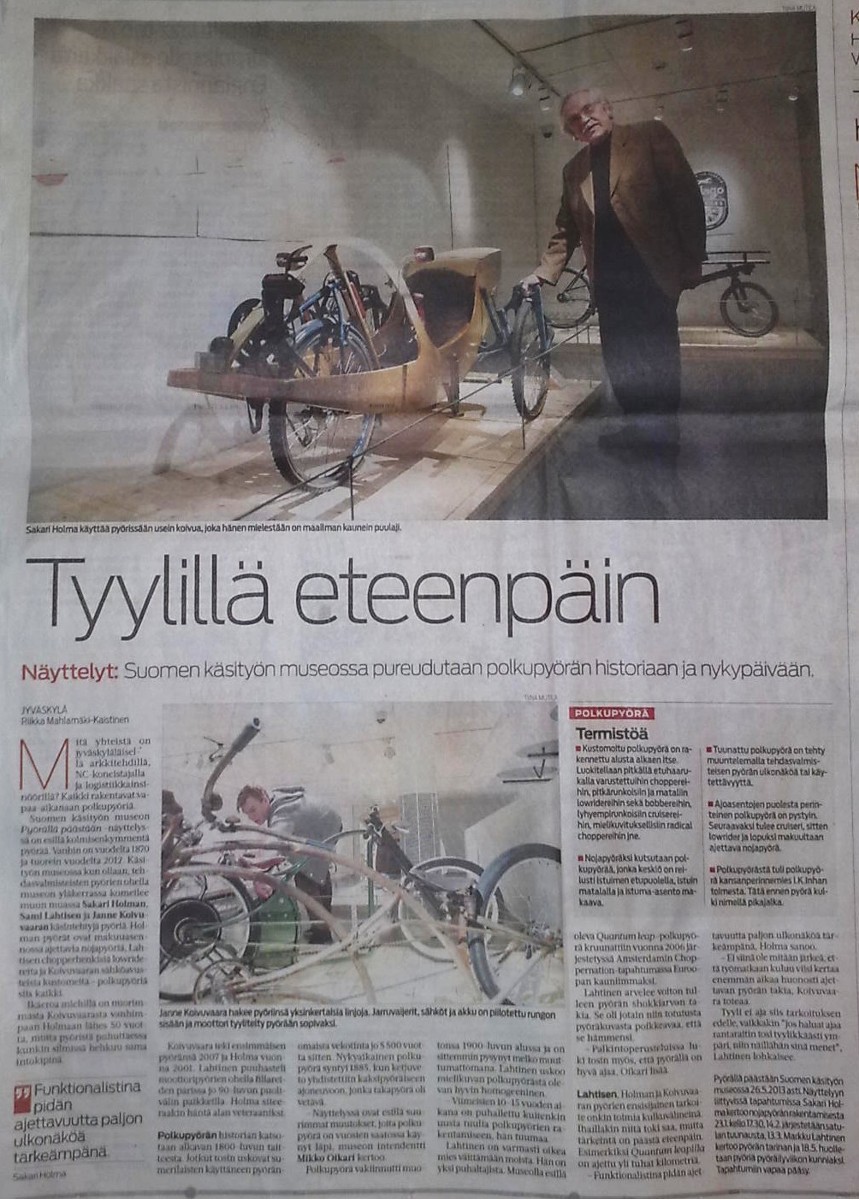 Ensi vuoden alussa loppiaisen jälkeen avautuu Suomen käsityömuseossa Jyväskylässä http://www.craftmuseum.fi/ näyttely, jossa esitellään polku-ja nojapyörien historiaa ja nykypäivää. Minulta on kutsuttu näyttelyyn muutamia nojapyöriä ja niihin liittyviä laitteita. Mukana on myös video nojapyörän rakentamisesta.