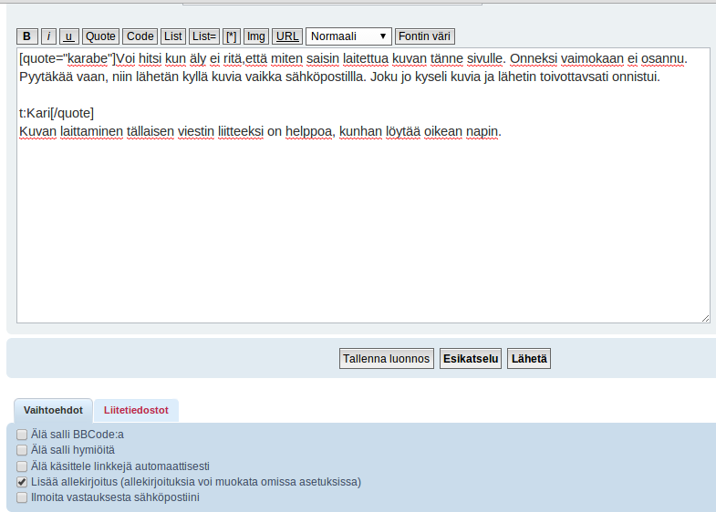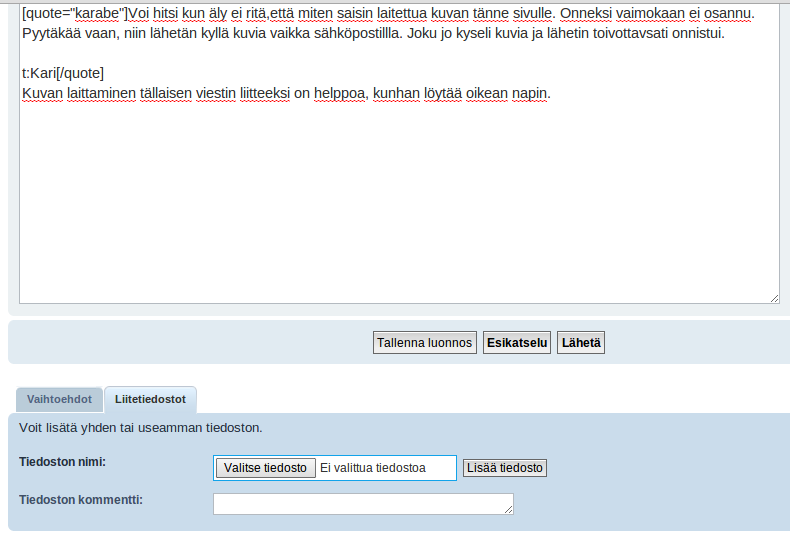 Kuvan laittaminen tällaisen viestin liitteeksi on helppoa, kunhan löytää oikean napin. Ensin valitset tuossa liitekuvassa punaisella näkyvän välilehden "Liitetiedostot". Sitten sen takaa napista "Valitse tiedosto" avaat koneesi tiedostoselaimen, jolla etsit haluamasi kuvan omalta koneeltasi. Sitten vain lähetä.