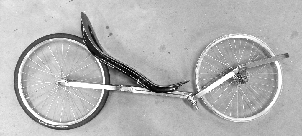 Kantsis pitää piirustukset mukana. Olis toi runkopalkki saanut olla hitusen pidempi = olis helpompi saada penkki sporttiseen kulmaan.Näyttäis tulevan kammet kovasti korkealle. Ei siinä että haittais ellei jyrkähkö sylikulma pudota "tehoja"... muuten oiken kompaktin näköinen laite. Mahtuuko nivuset oikeesti tuon etupyörän ja penkin väliin