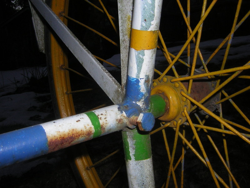 Invapyörässä on hitsattu mutterit akseliputken kylkeen ja niihin kierretty "pidätinruuvit"