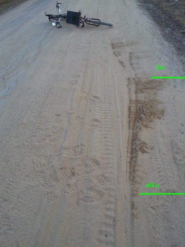 Tuossa 2m kohdalla, kun kaatuminen oli jo täysin varmaa, jäljet kulkee 10 cm päässä toisistaan. Vaikea sanoa syytä kaatumiselle, mutta renkaan luistamisesta se johtuu. Aina se tulee yllättäen - joka kerta