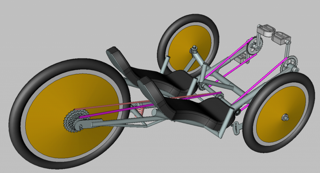 Rakentaisin itse ennemmin quadin jossa olis täysin erilliset voimansiirrot eri takapyörille jolloin polkijat voisivat täysin oman maun mukaan säätää vaihteensa. Eli ikään kuin kaksi trikeä joista toinen etupyörä puuttuu hitsattu rinnakkain.