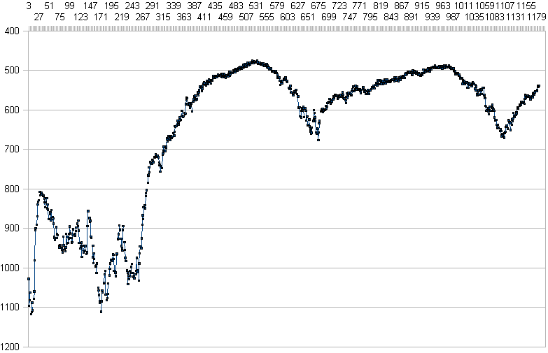 Kuvassa seisoskellaan vähän yli 200 havainnon ajan, sitten kävellään ylös 8 kerrosväliä (ylhäällä noin havainnon 530 paikkeilla, seisoskelua osin hississä, sitten uusi nousu 8 kerrosväliä, jne, keskytys 3. nousun noin 3. kerroksen kohdalla). On käytettävissä kokeen aikana ilmanpainemittarilla sijainti korkeussuunnassa mikron muistissa(ilmanpaineet ei kuvassa). Arvot ovat "raakoja", ts. tasoittamattomia. Kuvaa rakennettaessa taulukkolaskentaohjelmalla käyrään tuli "tyhjiä havaintoja" paljon, joten havainnon numero ei ole sama kuin sykähdyksen numero.