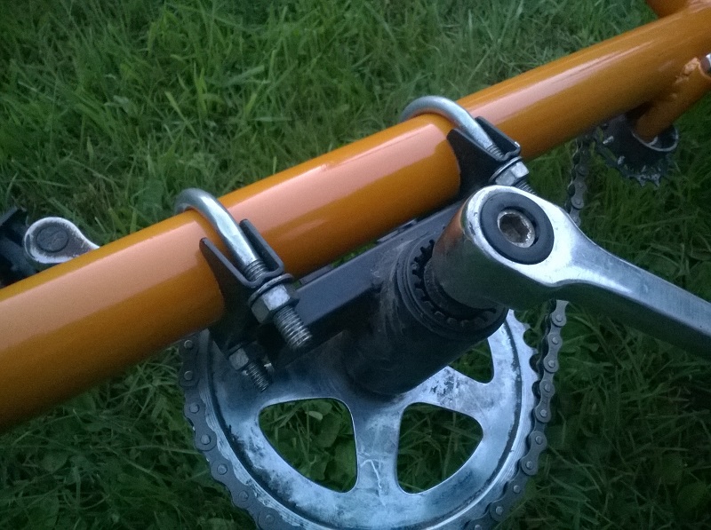 Kampikeskiö on hitsattu ensin 30x15(?) putkeen ja sen päihin sopivat pakoputkiklemmarit. Kuvassa näkyy myös ketjun ohjuri. Eli pätkä putkea hitsattu takapakasta puretun hammasrattaan kylkeen ja sisään laakeri.