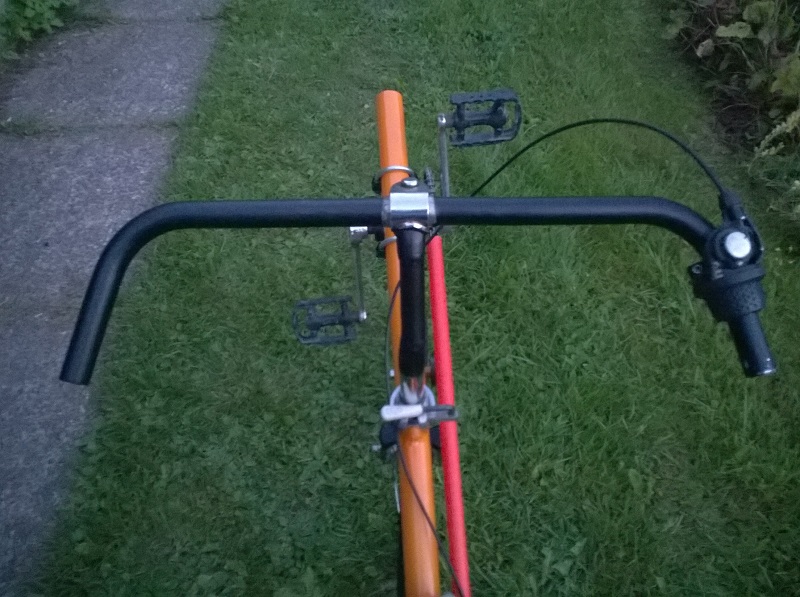Ohjaustanko on tehty tavallisesta mummopyörän tangosta. Alemmat mutkat on katkaistu pois, putken pätkien sisään työnnetty lyhyemmät pätkät pitämään osat suorassa ja hitsattu kiinni.