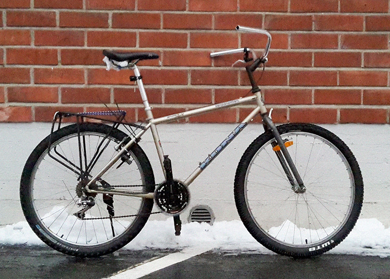 Mun tämän talven työmatkapyörä tässä. Roskalavalöytö. Kona Hahanna Race Light - olisko 90 luvulta. Vaihdoin lumi- ja loskakeleihin soveliaat karheemmat kumit alle.