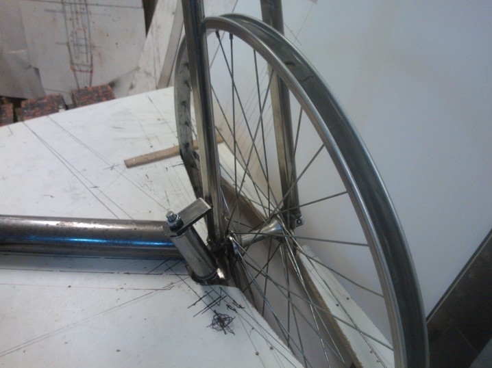 SH27:n rakentaminen on lähtenyt liikkeelle, ja runko on kuvissa esitetyissä vaiheessa. Etuhaarukan liittämisen olkavarteen teen taas eri tavalla. Kuvassa liitos on vielä kesken ja siinä onkin aikamoinen sovittelu ennen kuin pääsee hitsaamaan. Akseliputken sisässä on urakuulalaakerit. Liitokseen tulee tärinän vaimennus.