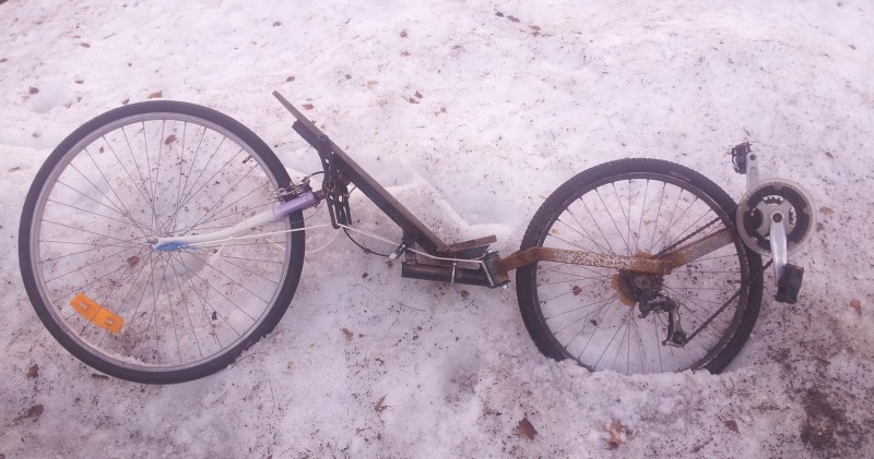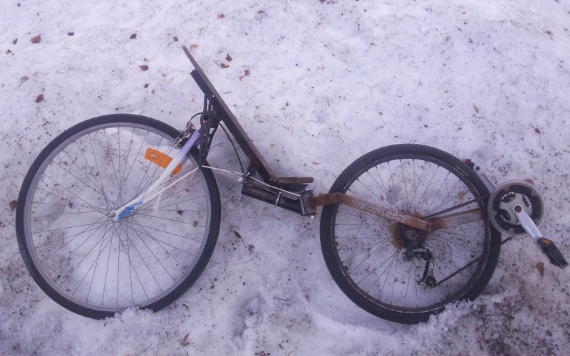Käytetyistä osista ja kokeiluluonteesta johtuen nivel on turhan edessä ja raideleveyskin vain puoli metriä. Kaatuu helposti ja toinen takahaarukkakin menee yrittämättä solmuun :roll: Eturenkaan kääntökulma perään nähden on noin 135 astetta ennen kuin keskiö ottaa maahan, joten pyörä on kohtuullisen ketterä :mrgreen: Ajokelpoiseltä vaikutti, mutta valojen ja jarrujen puutteen takia kokeilin vain hieman pihalla.