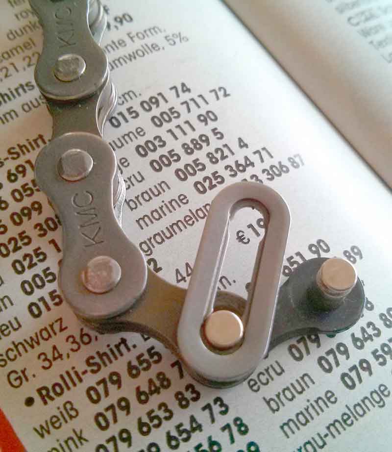 Itse olen tottunut lopuksi vielä painamaan ketjuun liikkumavaraa siirtämällä ketjua pykälän ylöspäin katkaisutyökalussa ja sitten painanut työkalulla pinniä. Näin pystyy jopa käyttämään vanhan pinnin uudelleen. On tärkeää saada liitoskohta joustamaan sivusuuntaan. Monta vuotta olen ajanut siten että ykköspyörällä ajan ketjun kunnes se on venynyt 0.75mm. Sitten vaihdan ketjun kakkospyörään ja ajan kunnes on venynyt 1.5mm. Koskaan ei ole ketju vielä pettänyt. Kop kop...