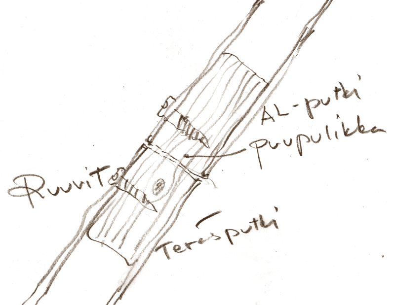 Takapää on leikattu ja naputeltu muotoon ja kiinnitetty runkoon 5 mm pulteilla. Etupään kiinnityksessä on liitoskohdassa putkien sisässä sopivan paksuiseksi vuoltu n. 12 cm pituinen puutappi puuruuvikiinnityksellä.
