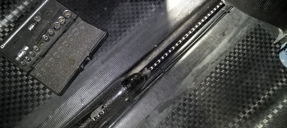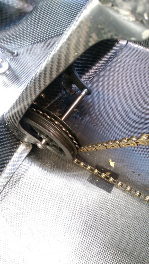 Kun kerran oli luukut auki, niin sain myös vihdoin putsattua ketjusta inhottavat tehtaan rasvat pois. Samalla oli hyvä tilaisuus ottaa voimalinjan lyhyt ketjuputki pois, se kun oli kiusannut minua alusta asti. Laitoin tunnelin pohjalle hieman tarranauhaa pehmusteeksi, mutta taitaa olla turha. Pieni testikierros ja koko voimalinja hiljeni huomattavasti!! Nyt oli vaarana lattialla olevien tavaroiden imeytyminen ketjun mukana, joten eikun hommiin askartelemaan suojalevyä. Kun ketju oli pudonnut taaimmaiselta rissalta, olin polkaissut sen ketjuputken ja hiilikuidun läpi, joten sen voisi korjata samalla vaivalla. Tuota rikki mennyttä nokkaa ei tarvita kuin ketjuputken kiinnittämiseen, joten olisin toisaalta voinut leikata nokan myös kokonaan pois.
