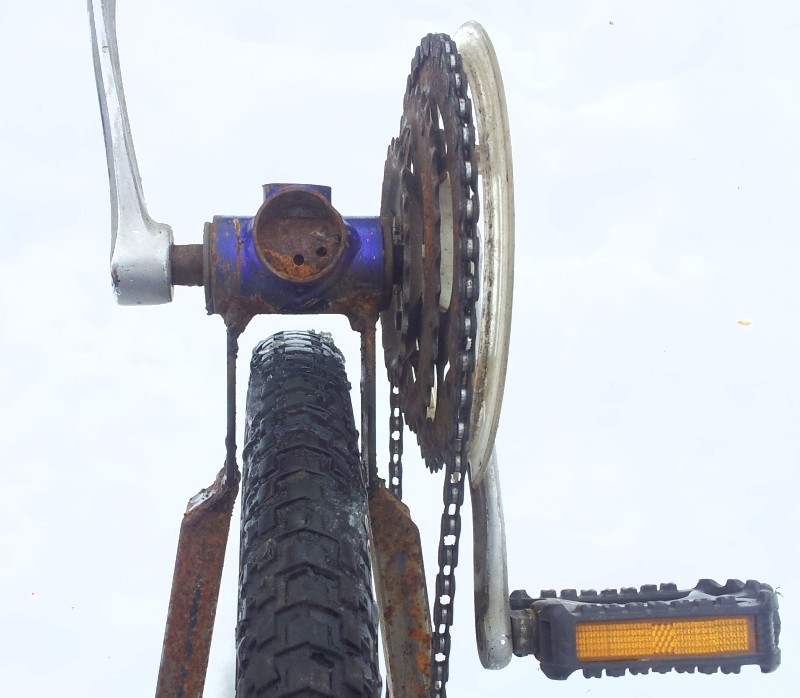 Tuolla rakenteella saa poljinkeskiön sentin päähän renkaasta, silloin ei normaali ohutkaan ketjuputki mahdu edes vasemmalle.