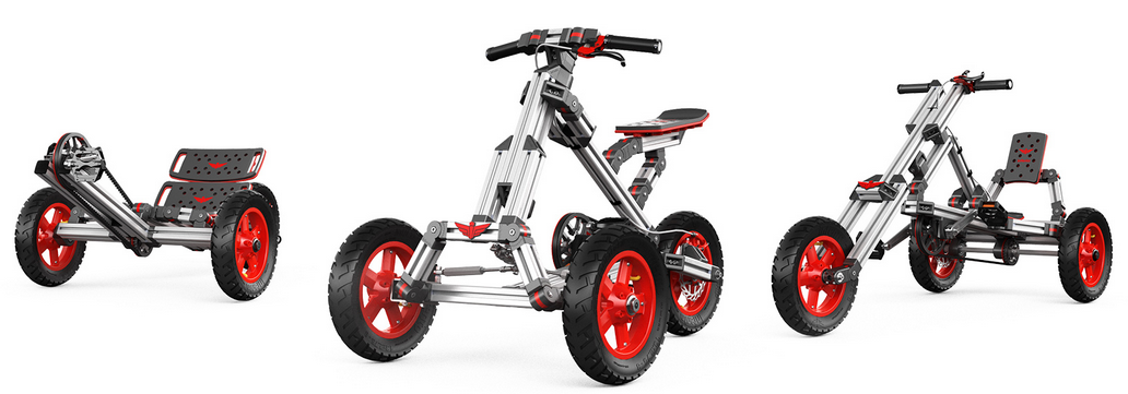 Ainakin nuo profiilipalkki-, kulma-, ja nivelkappaleet ovat teollisuusrakennelmien kuten työpöytien ja asennusjigien vakiokamaa rakennussarjana, samoin umpikumipyörät jostain vastaavasta luettelosta. Vähän "polkupyöräosaa" höysteeksi ja pyörämekano on valmis. Hyvä idea, samalla saadaan hintaan se puuttuva nolla perään... no jaa, ehkä vain tuplat.