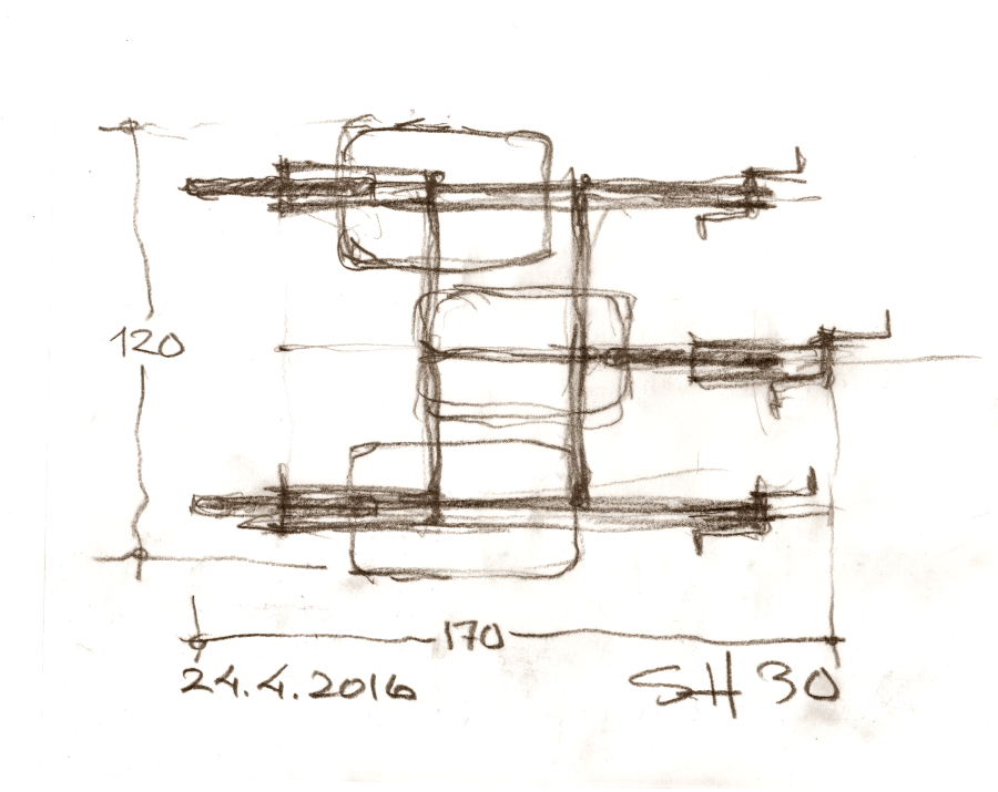 Olen tässä puristellu SH30:tä 120 cm:n leveysmittaan, ja saattaa se onnistuakin. Pituudenkin suhteen on rajoituksena hissin koko, jolla kuljetan tavaroita toisen kerroksen pajaani. Sen mitat ovat 150 x 207 cm. Sakaarit unohtuivat piirroksesta. Ne ovat tarpeen ikääntyvien mennessä istumaan ja ylös noustessa. Ei tästä taida saada selvää ennen kuin piirrän puhtaaksi?
