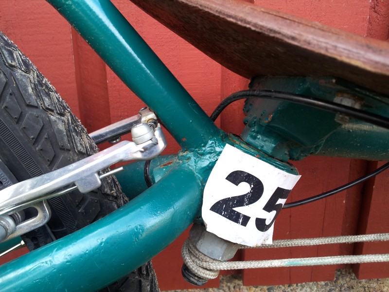 Myös takahaarukka on liian löysä ja punoutuu käännöksissä. Se pitää vaihtaa tukevampaan ja samalla voisi korvata tuon takahaarukan nivelen yläpuolisen rungon pätkän paksummalla ja pidemmällä. Penkin yläpääkin joustaa voimalla polkiessa.