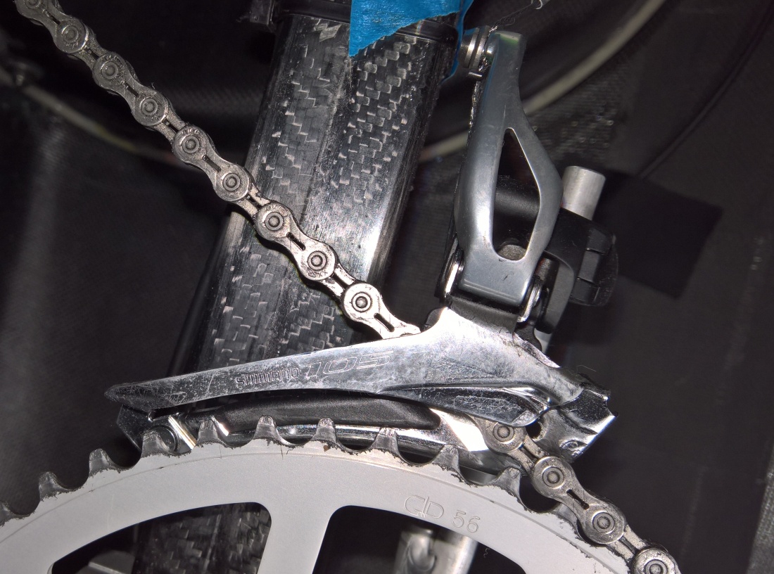 Voisitko kuvata oman kinnerisi sisältä ketjun ja etuvaihtajahäkin keskinäistä liikettä ajon aikana. Välttämättä ei tarvitse edes ajaa, vaan riittää hyvin kun laitat ketjun edessä pienelle rattaalle, jarrut pohjaan ja polkaisuvoimaa vasemmalla jalalla vaihdellen lataat liikettä kameralla videoksi.
