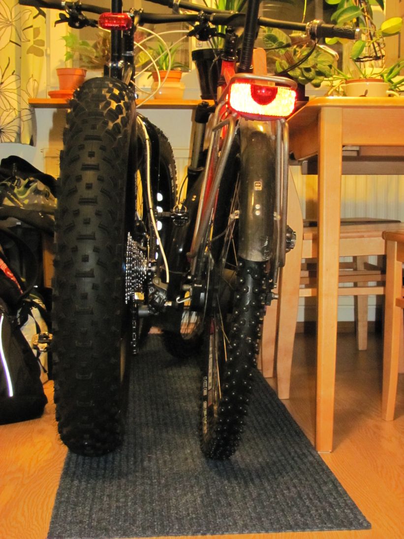 Toisen topikin peräkärrykuvien yhteydessä otin vielä yhden kuvan, josta voi ihmetellä renkaiden kokoeroja. Oikealla siis Schwalben Ice Spiker koossa 26x2,1" ja vasemmalla Surlyn Lou 26x4,8" ![]()