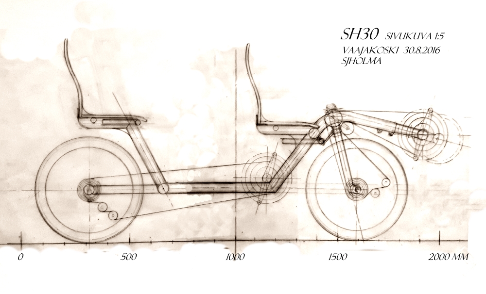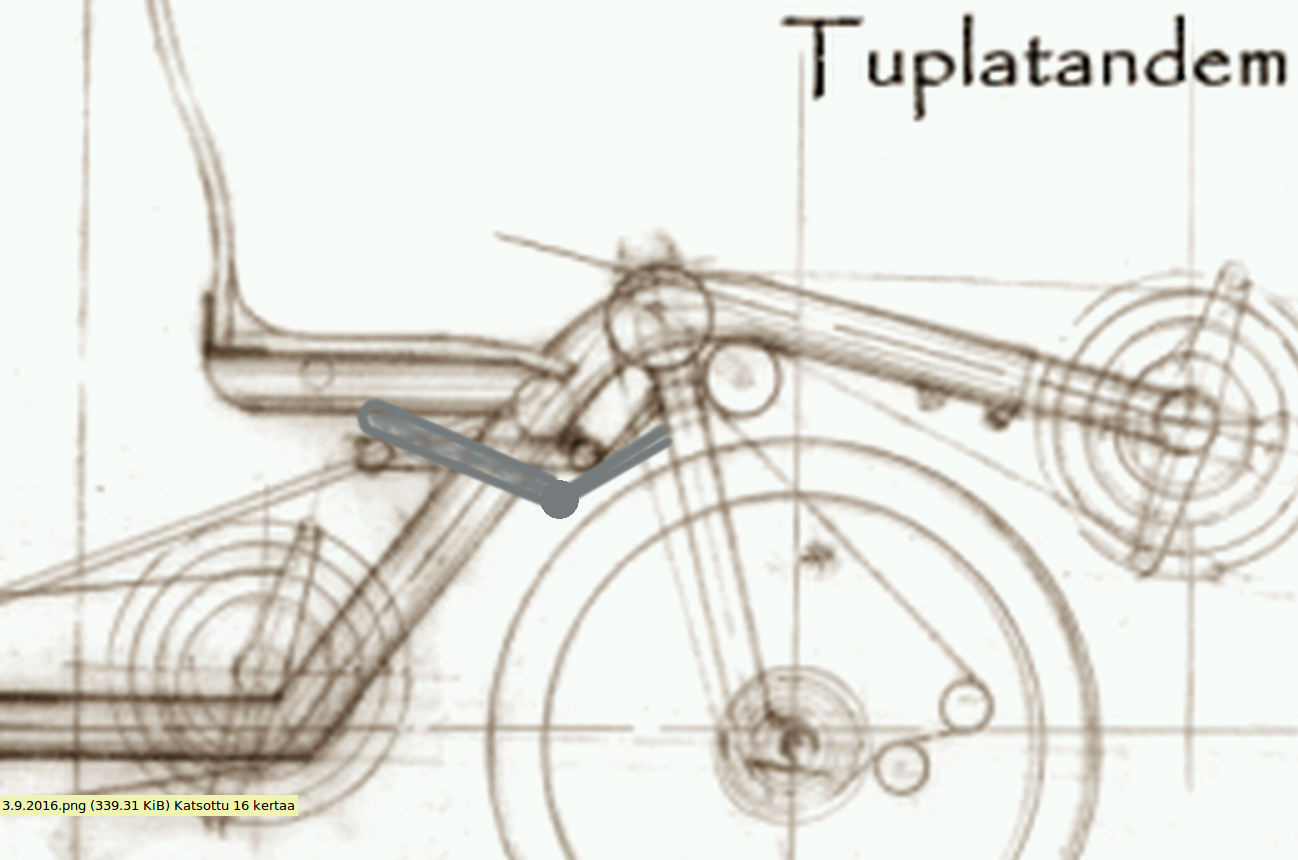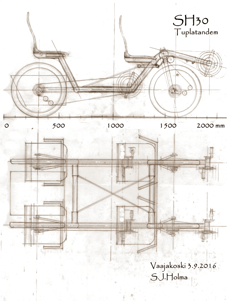 Näyttää hienolta, kuitenkin ehotan uudestaan keskiötä rungon alapuolelle jos kerran tarkotus taakse istuttaa huonojalkasia vanhuksia - ei tartteis jalkaa nostaa ketjun yli. Tuskin etuvaihtajaa tuossa tarvitaan, yks ratas eteen. Takahaarukkaa joutunee kyllä taittamaan, ett ketjun saa menemään ali.