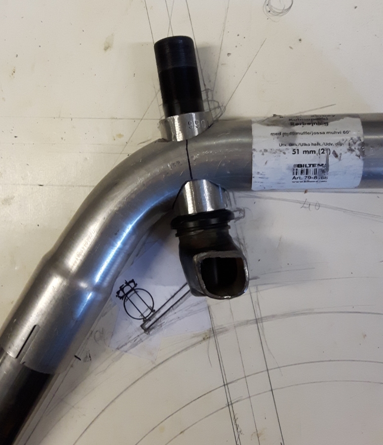 Joo, minähän näitä kuvia piirtelen sillä tavalla vääräoppisesti ikäänkuin materiaalit olisivat läpinäkyviä. Niinkuin allaolevassa kuvassa näkyy ohjainvarren ja raidetanngon yhtymäkohta on kovin ahdas, kun olen koittanut varata lokasuojillekin tilaa. Ojainvartta saa myös pidennettyä laskemalla emäputkea hiukan alemmaksi. Yhdyspuomia voi myös nostaa hiukan korkeammalle.