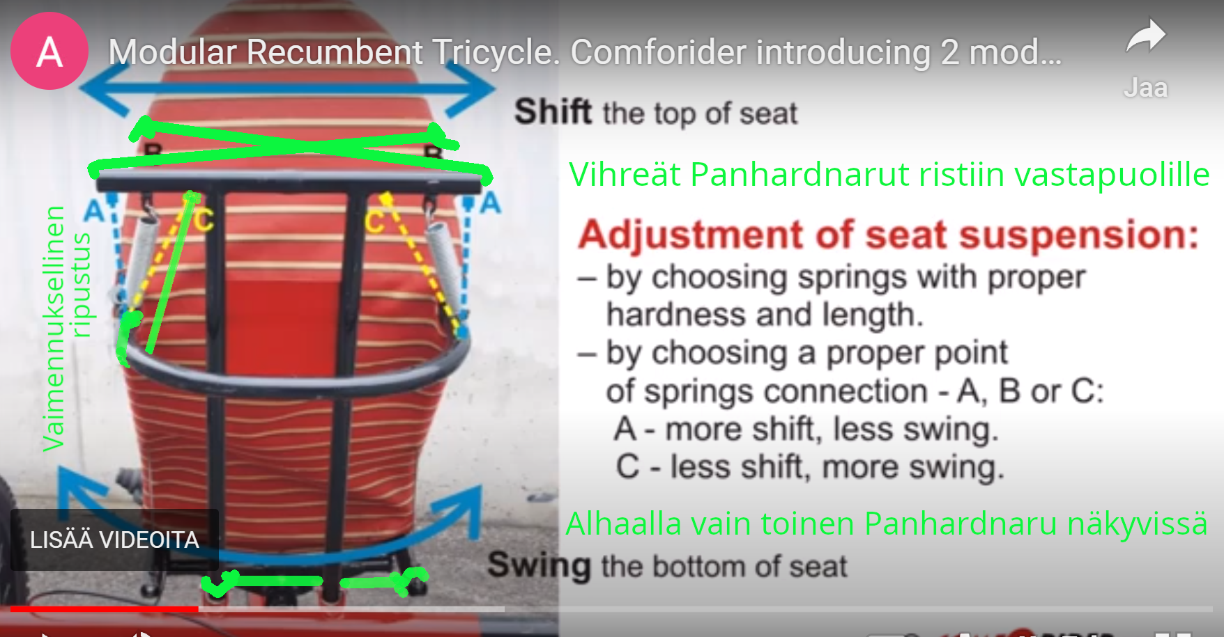Tuon lisäksi enintään pystyliikkeen vaimennusta siihen kaipaa, mutta siihen onkin jo monia ideoita nojapyöräfoorumin historian kellastuneilla lehdillä. Pelkkä vetojousen kiinnityksen muuttaminen naruvälitteiseksi tuottaa helpon kitkavaimennuksen.