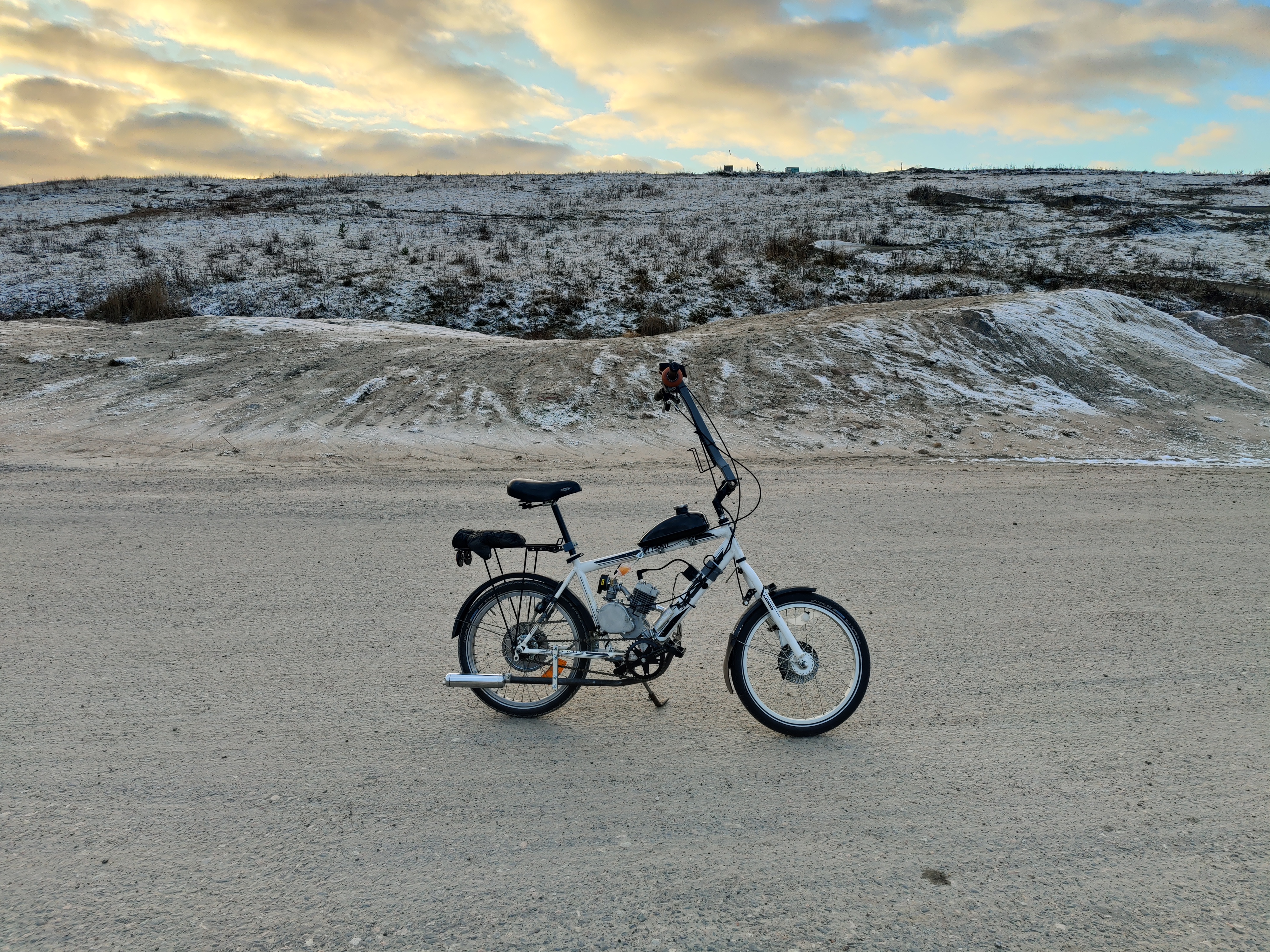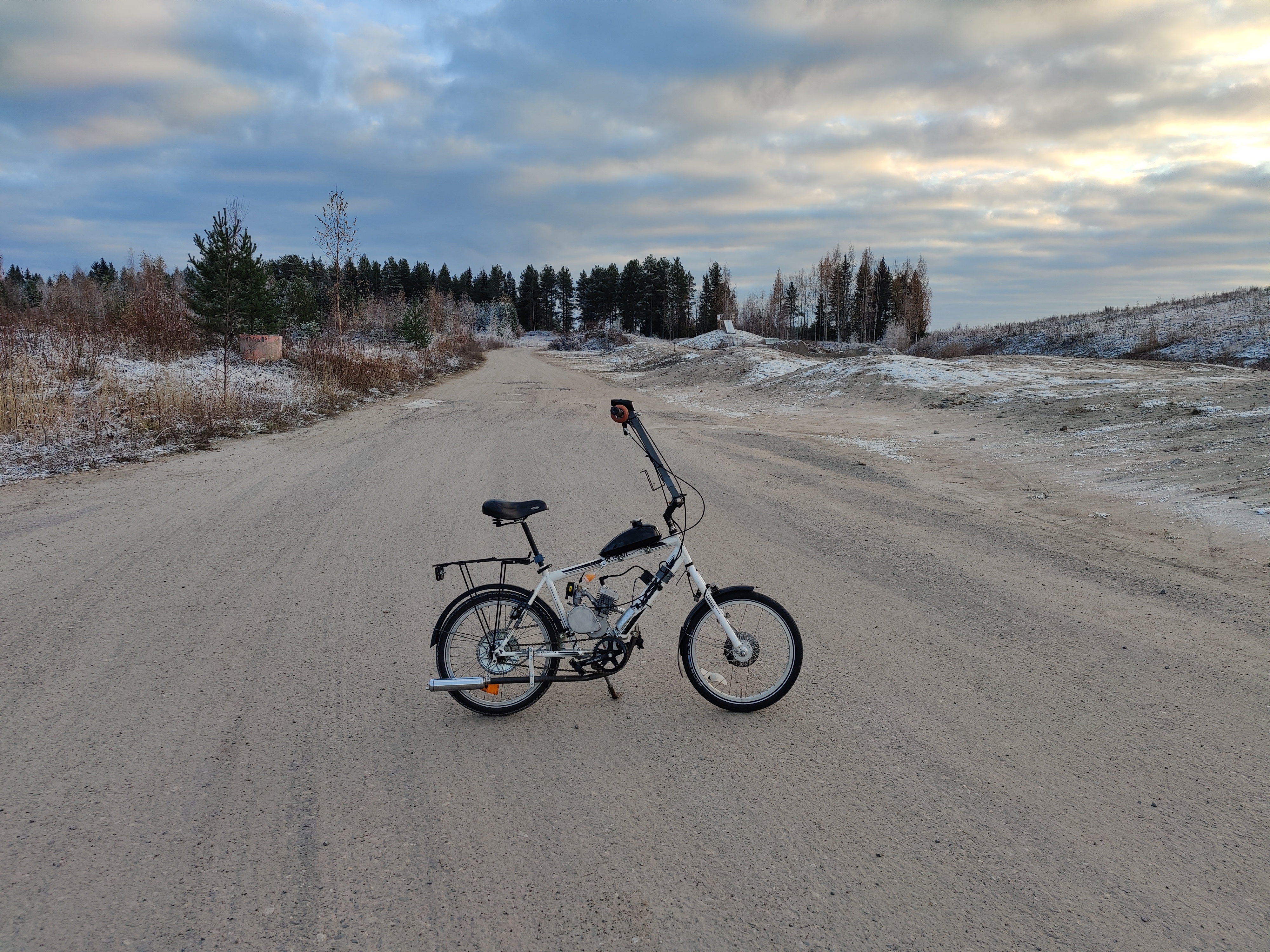 Aika terhakasti mäet nousi (joo, täältäkin löytyy mäkiä kun oikein hakee) kun piti vauhtia 20km/h tuntumassa ja antoi kaasua reippaasti. No kaasuhan ei aukea tällä hetkellä kuin noin 60% ja mittaria ei ole. Risteysajossa pitää lukita kytkin pohjaan ja polkea menemään, muuten kone alkaa rytkyttämään kun kierrokset menee liian pieniksi. Vieläkin sais olla tiheämmät välitykset.