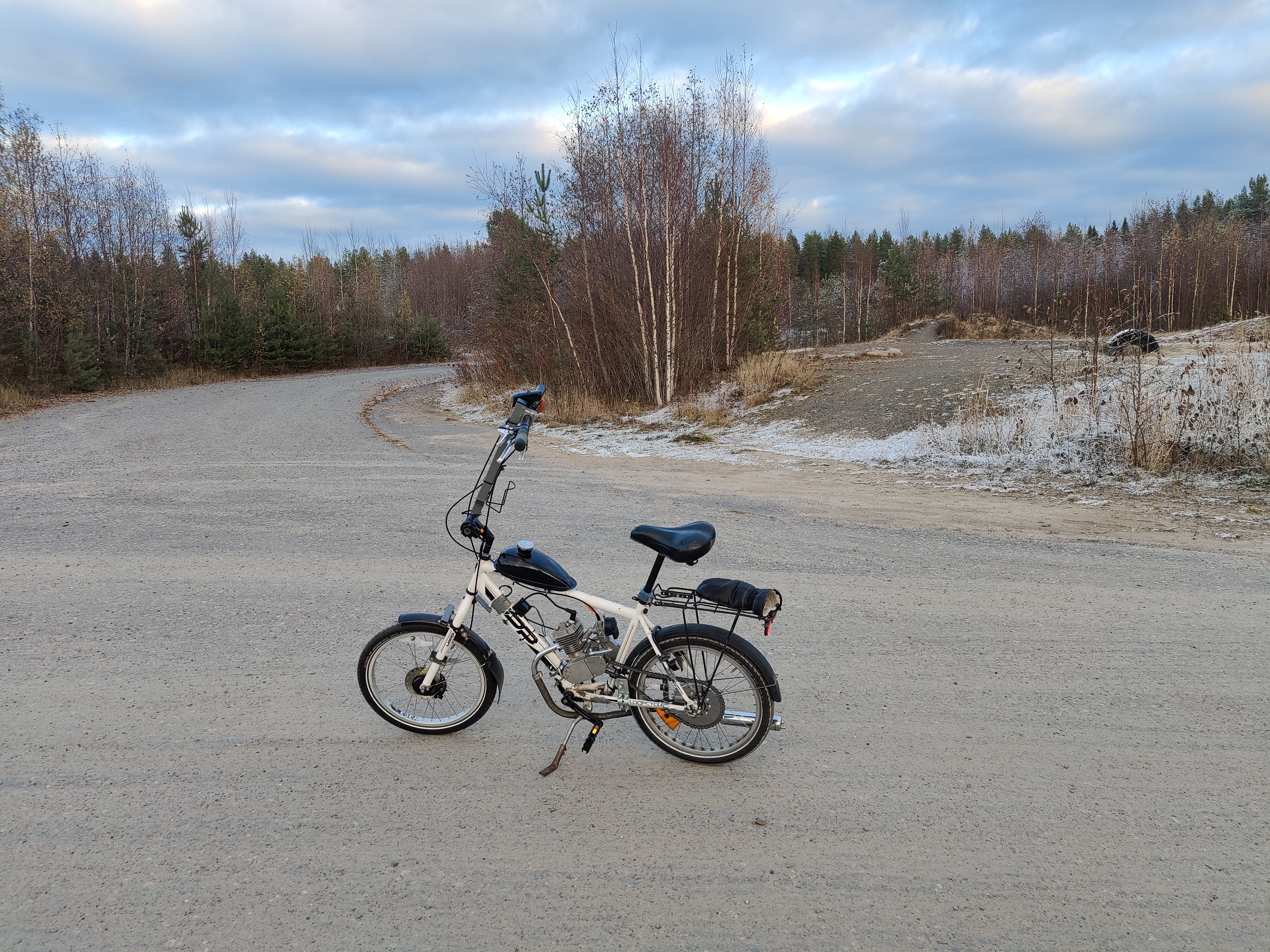 Eka oikea testilenkki bensalenkkari-urani lähtöpisteeseen. Entiseen Iinatin moottoriurheilukeskukseen, nykyiseen Kaakkurin liikuntamaaahan. Taitaa olla aika tasan 40 vuotta siitä, kun eka kertaa täällä mopolla ajoin. Ajoin sen jälkeen motocrossia ja jokamiesluokkaa. Nyt tämä alue on polkupyörille tarkoitettu, siispä moottoroitu polkupyörä on just oikeaa jatkoa. :D