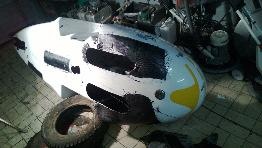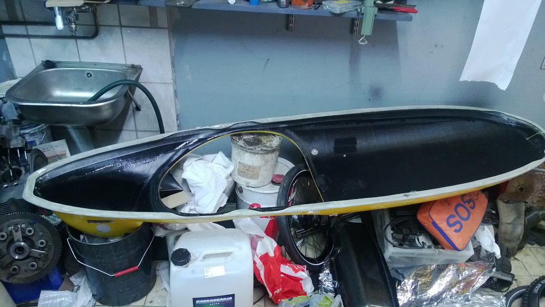 Joo, sääli on sairautta :mrgreen: ja ne on toiset miehet joiden elämäntehtävä on pyörän puunaus :) Noista keulan ratkeamista aika moni on tullut metsäyöpymiseen siirtyessä kun jossain heinikon seassa on ollut yllättävä kivi tms. Tuli sekoitettua vähän turhan iso satsi sitä epoksia niin pohjaan sitten vetelin muutaman ylimääräisen suikaleen hiilikuitumattoa missä nyt raapiumia näkyi. Samoin sisäpuolella vahvistelin vielä keulan tavarataskuja ja jalka-aukkojen ympärille laitoin lisää matskua. Reilu neliö sitä mattoa meni. Jos napadynamon laskee mukaan niin varmaan kilolla tulee painoa lisää, vaan jospa se kestäisi.